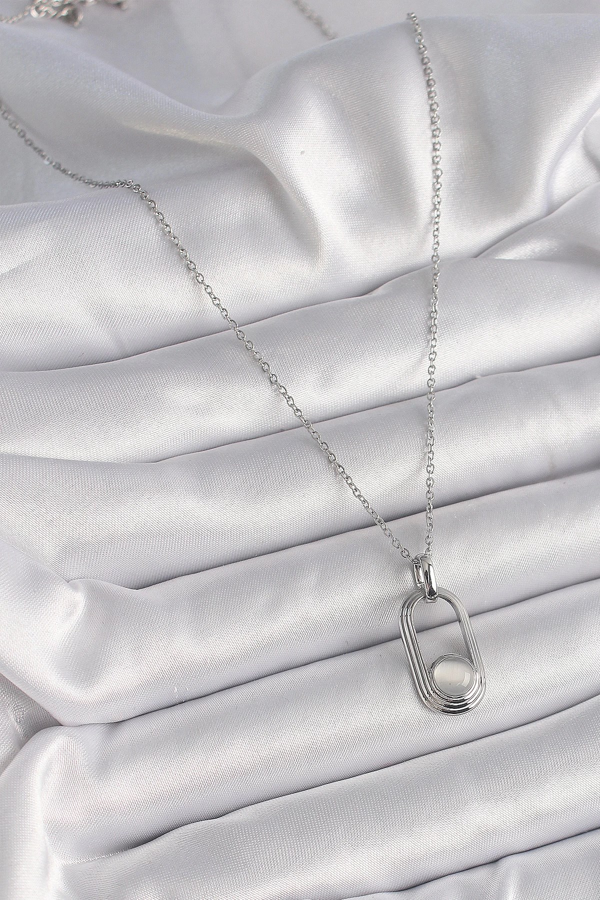 Mey İthalat® 316L Çelik Gümüş Renk Zincir Beyaz Kedi Göz Model Kadın Kolye