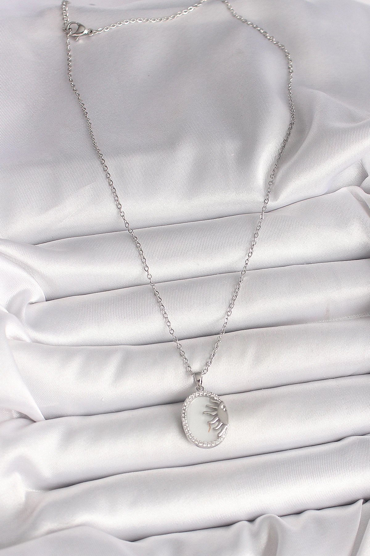 Mey İthalat® 316L Çelik Gümüş Renk Zincir Beyaz Mineli Gün Batımı Model Zirkon Taş Detaylı Kadın Kolye