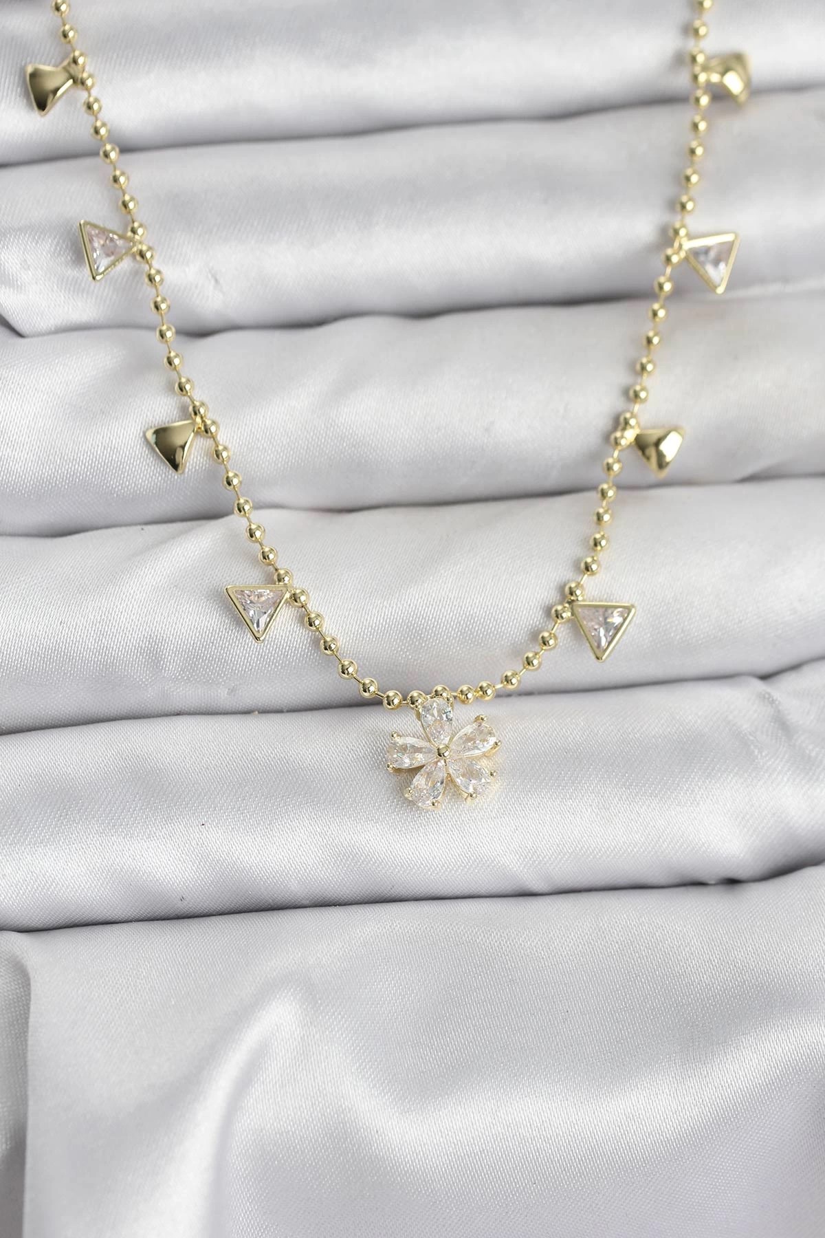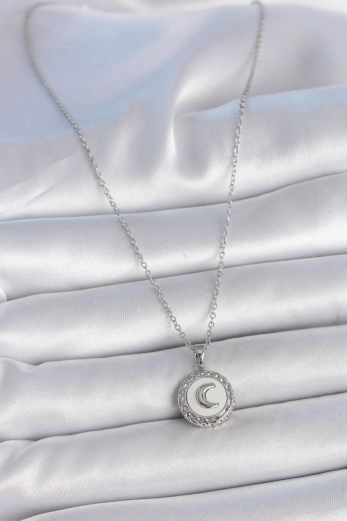 Mey İthalat® 316L Çelik Gümüş Renk Zincir Beyaz Mineli Hilal İşlemeli Madalyon Model Kadın Kolye