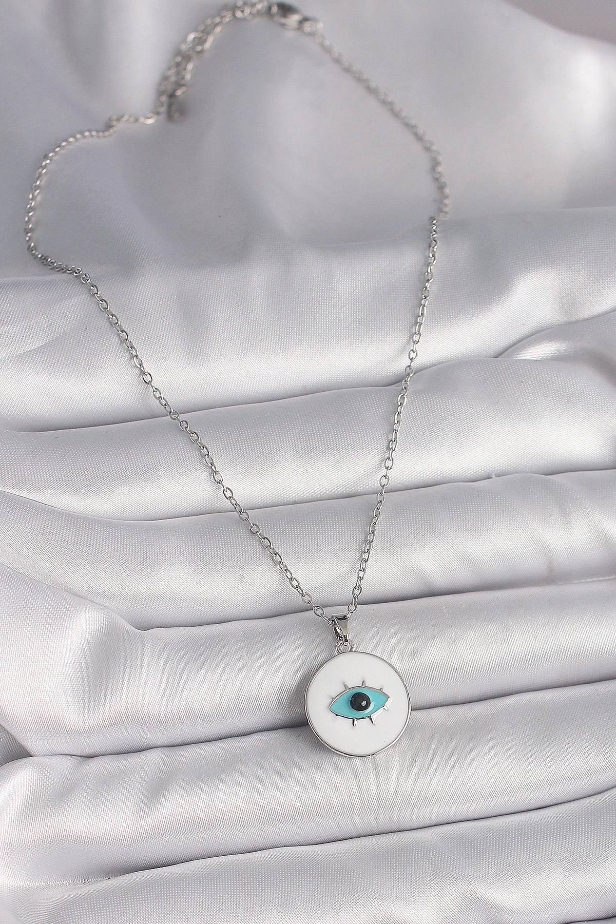 Mey İthalat® 316L Çelik Gümüş Renk Zincir Beyaz Mineli Turkuaz Göz İşleme Model Kadın Kolye