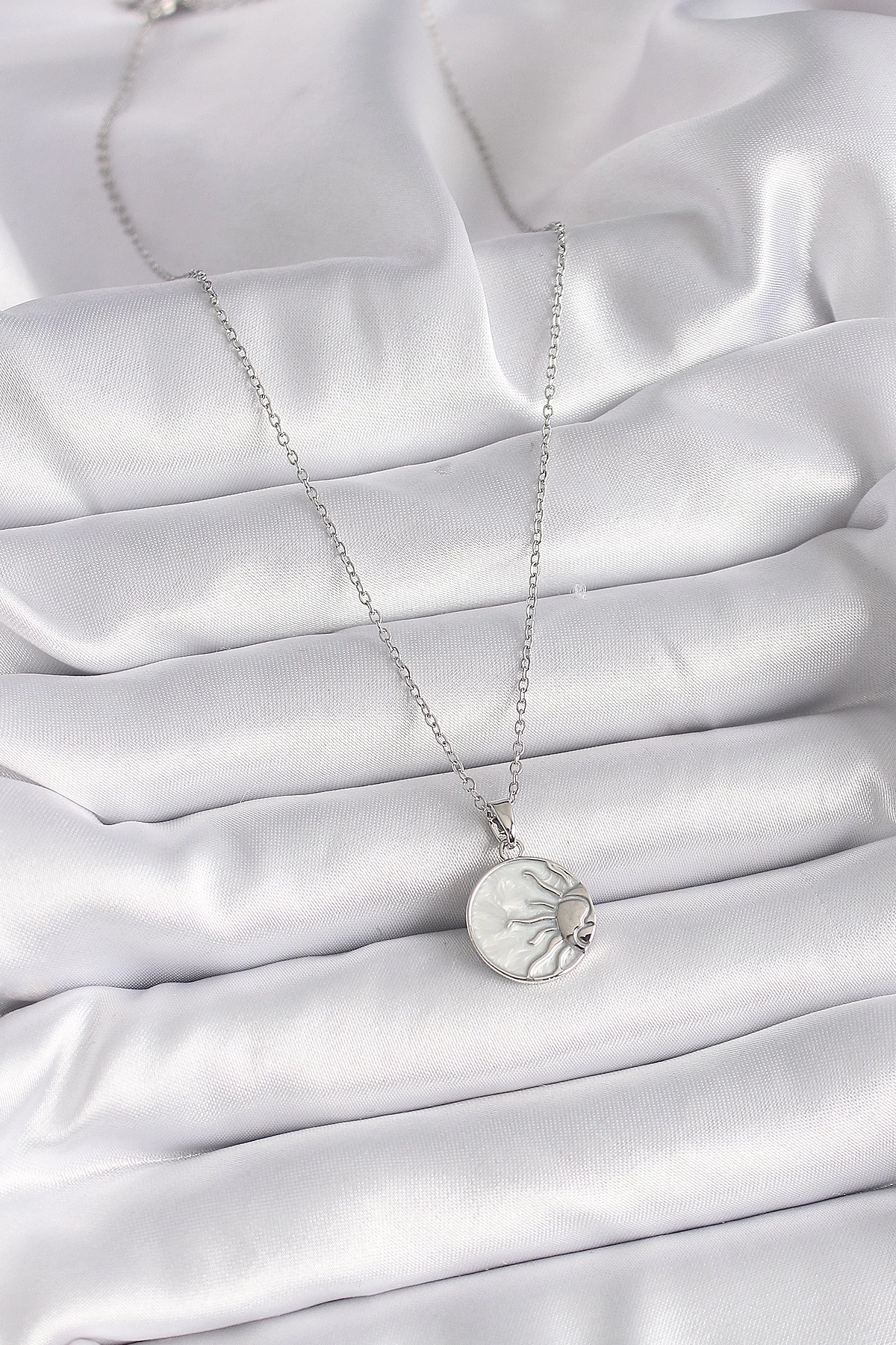 Mey İthalat® 316L Çelik Gümüş Renk Zincir Beyaz Sedefli Gün Batımı Model Kadın Kolye