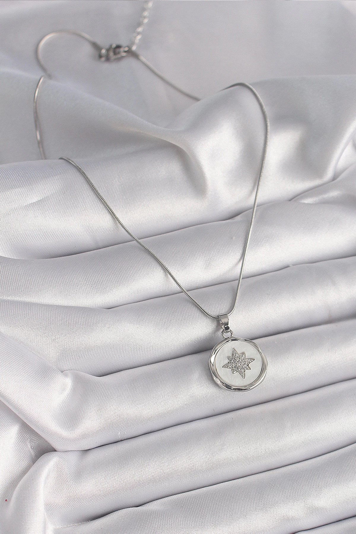 Mey İthalat® 316L Çelik Gümüş Renk Zincir Beyaz Sedefli Zirkon Taşlı Yıldız İşleme Model Kadın Kolye
