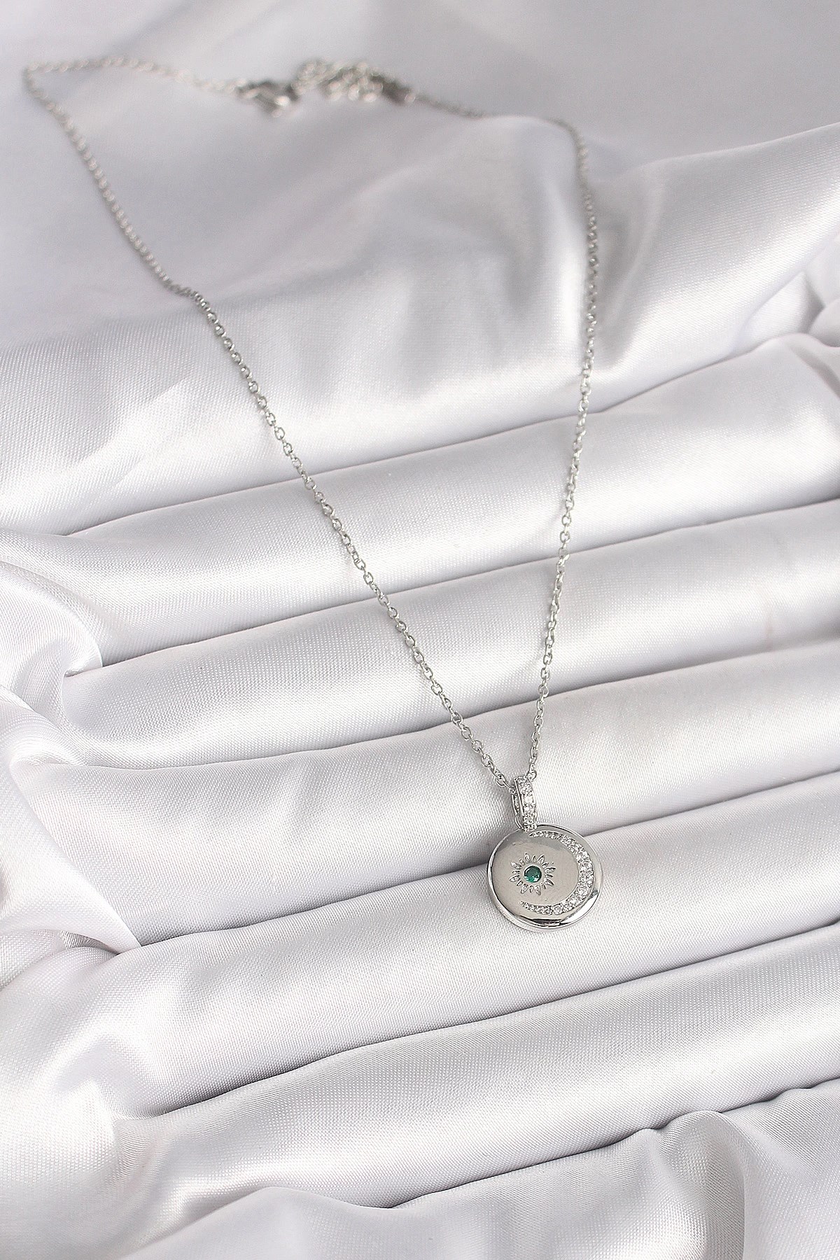 Mey İthalat® 316L Çelik Gümüş Renk Zincir Madalyon Zirkon Taşlı İşlemeli Hilal Yıldız Model Kadın Kolye