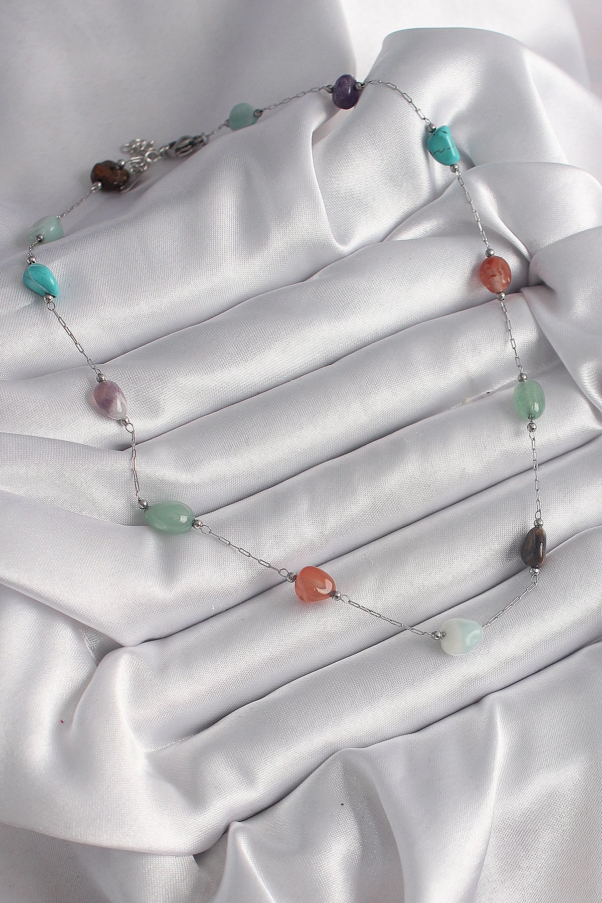 Mey İthalat® 316L Çelik Gümüş Renk Zincir Renkli Doğaltaş Model Kadın Kolye