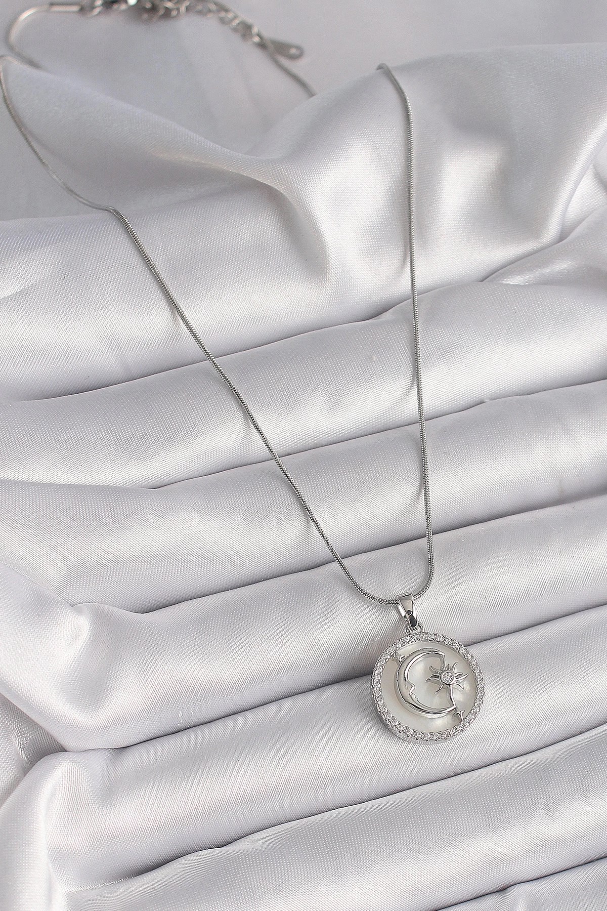 Mey İthalat® 316L Çelik Gümüş Renk Zincir Zirkon Taş Detaylı Beyaz Sedefli Ay Yıldız İşleme Kadın Kolye