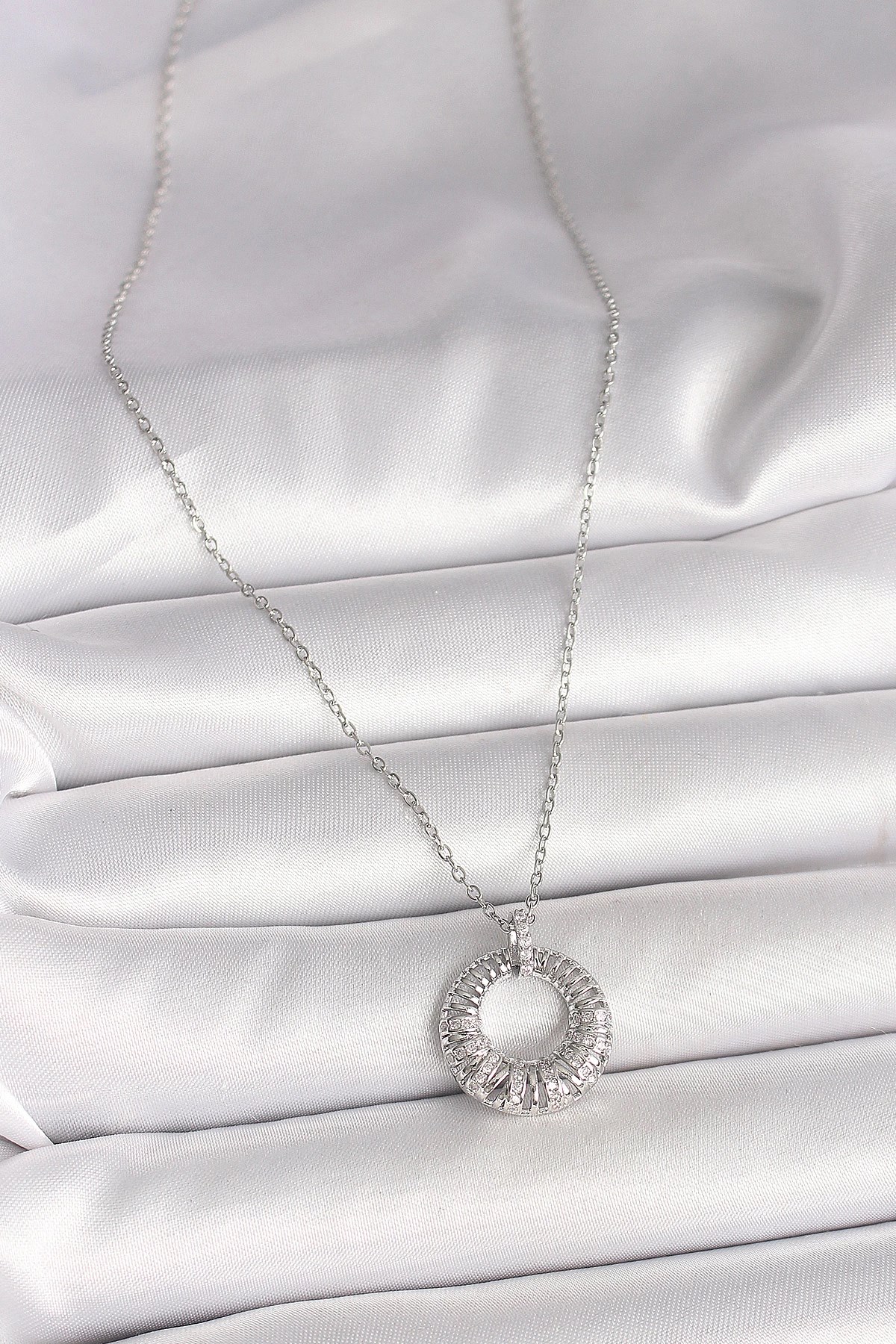 Mey İthalat® 316L Çelik Gümüş Renk Zincir Zirkon Taş İşlemeli Daire Model Kadın Kolye