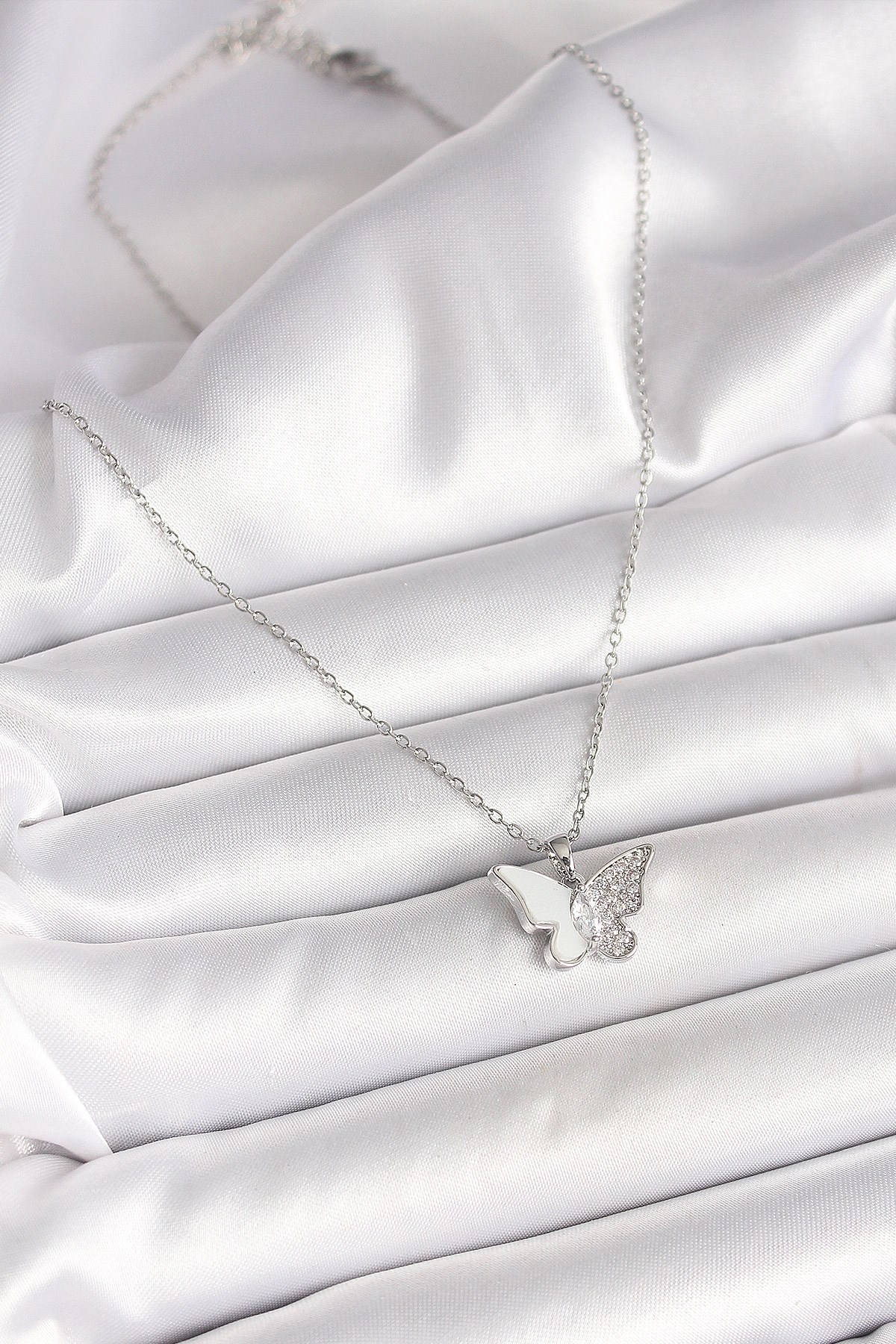 Mey İthalat® 316L Çelik Gümüş Renk Zincir Zirkon Taşlı Beyaz Mineli Kelebek Model Kadın Kolye