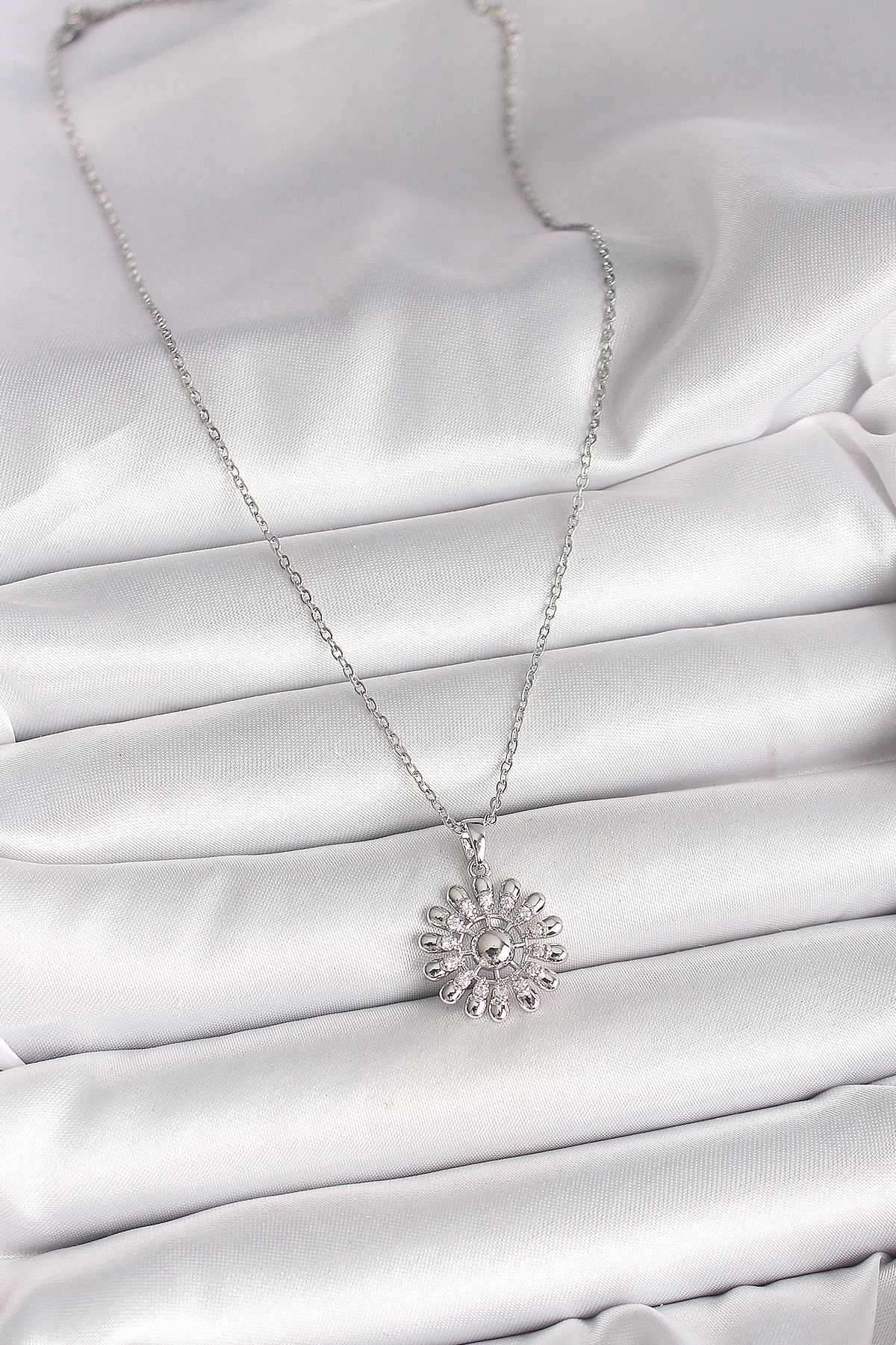 Mey İthalat® 316L Çelik Gümüş Renk Zincir Zirkon Taşlı Güneş Model Kadın Kolye