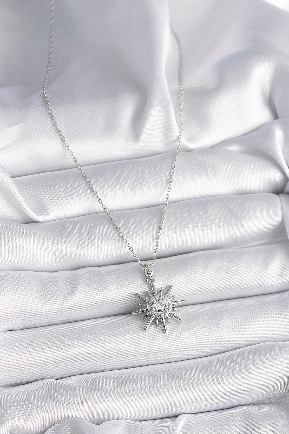 Mey İthalat® 316L Çelik Gümüş Renk Zincir Zirkon Taşlı Güneş Model Kadın Yüzük