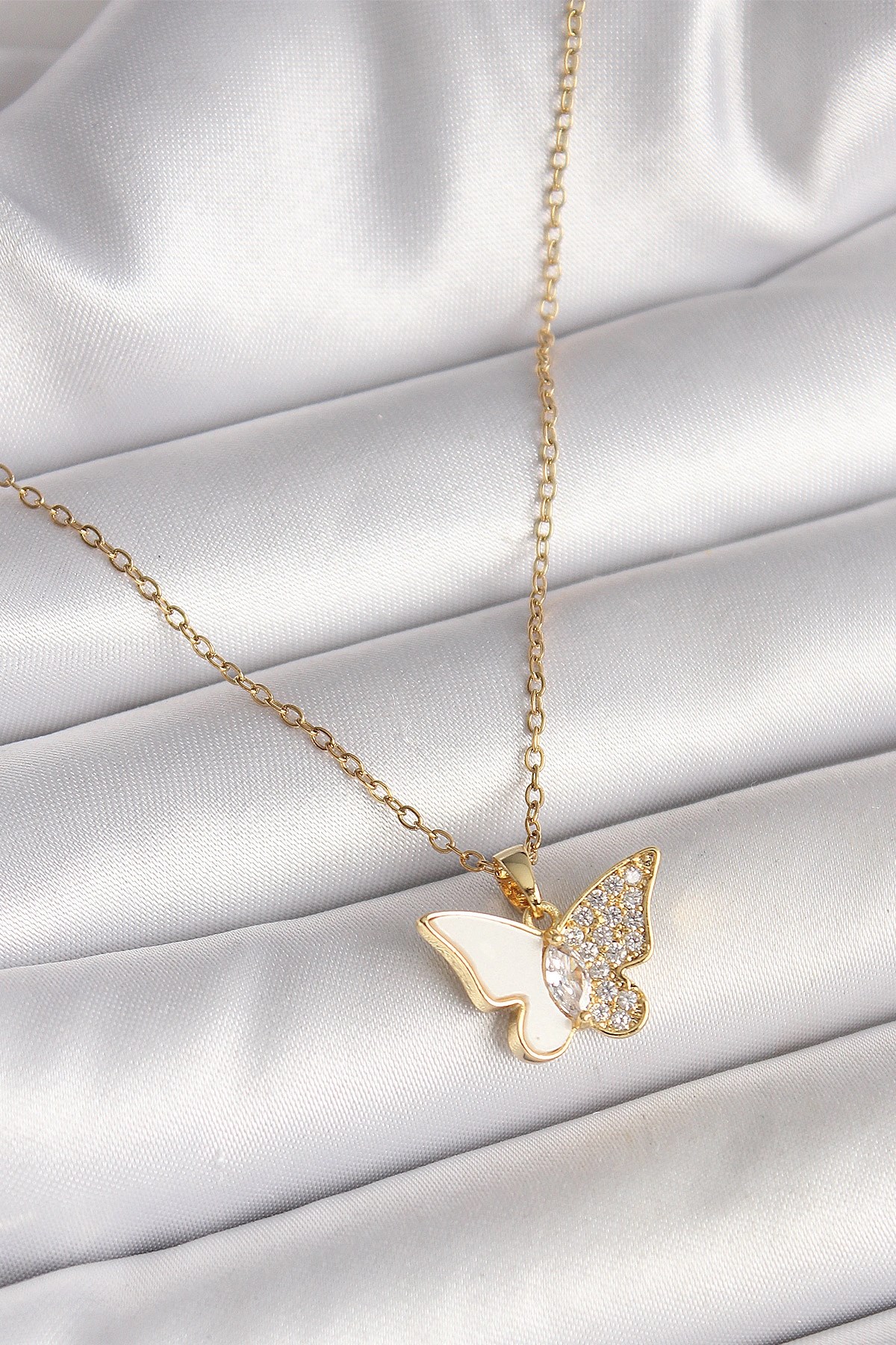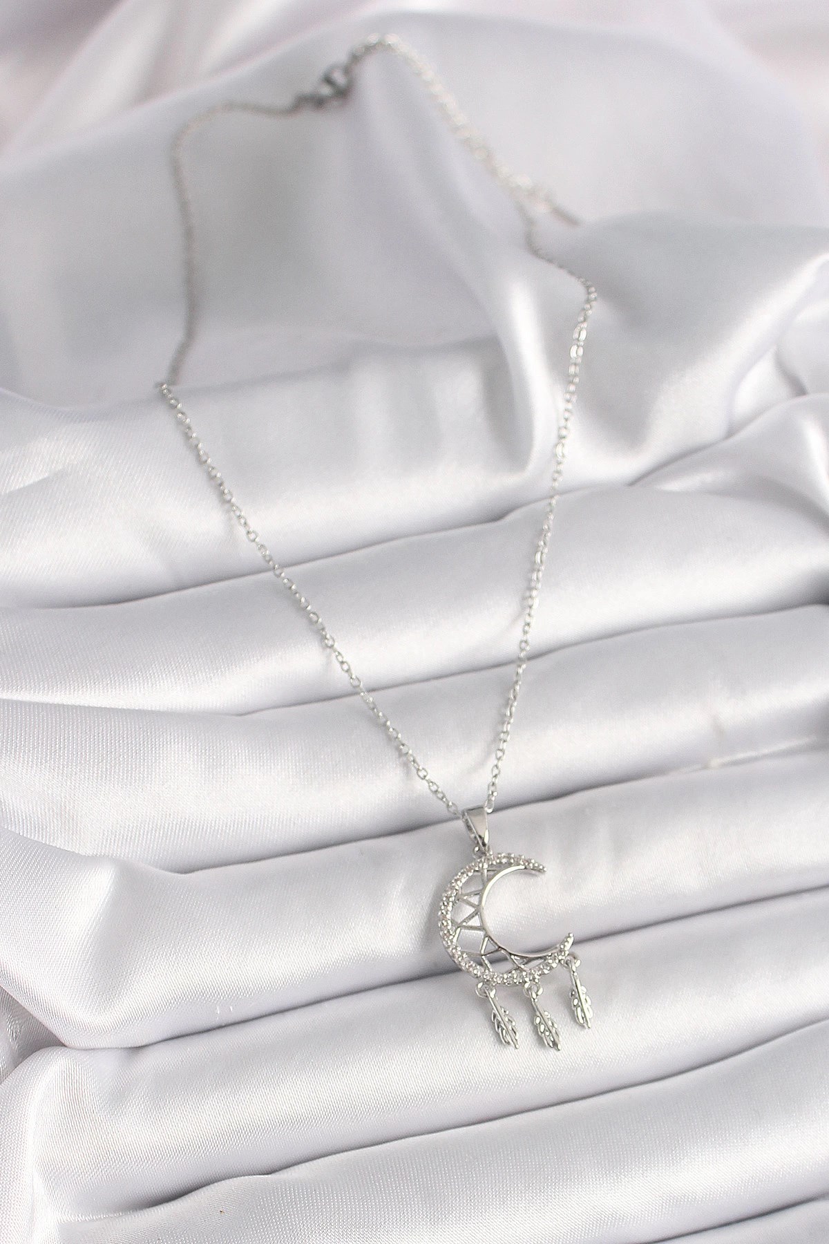 Mey İthalat® 316L Çelik Gümüş Renk Zincir Zirkon Taşlı Hilal Model Sallantı Yaprak Detay Kadın Kolye