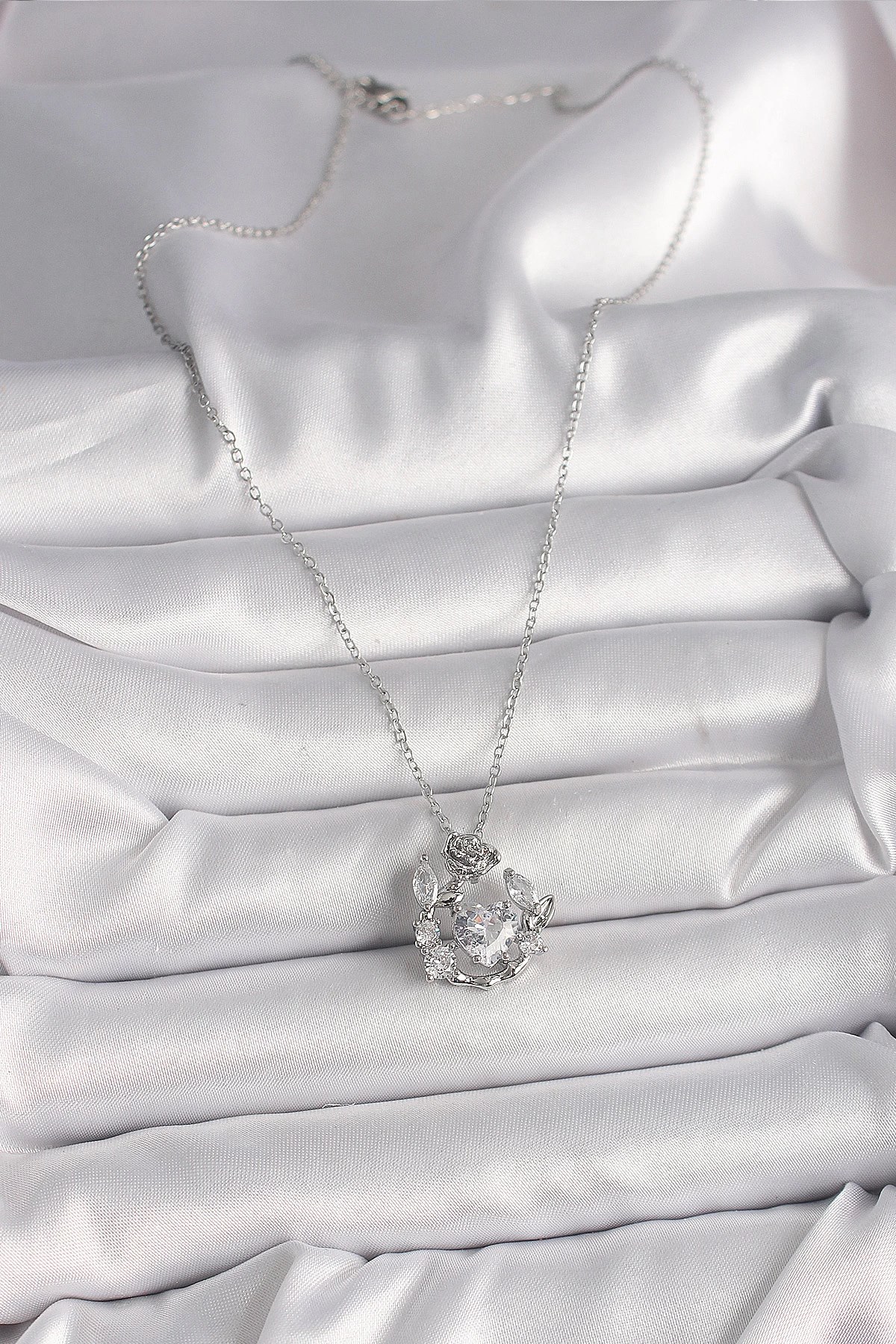 Mey İthalat® 316L Çelik Gümüş Renk Zincir Zirkon Taşlı Kalp Figür Gül Detay Kadın Kolye