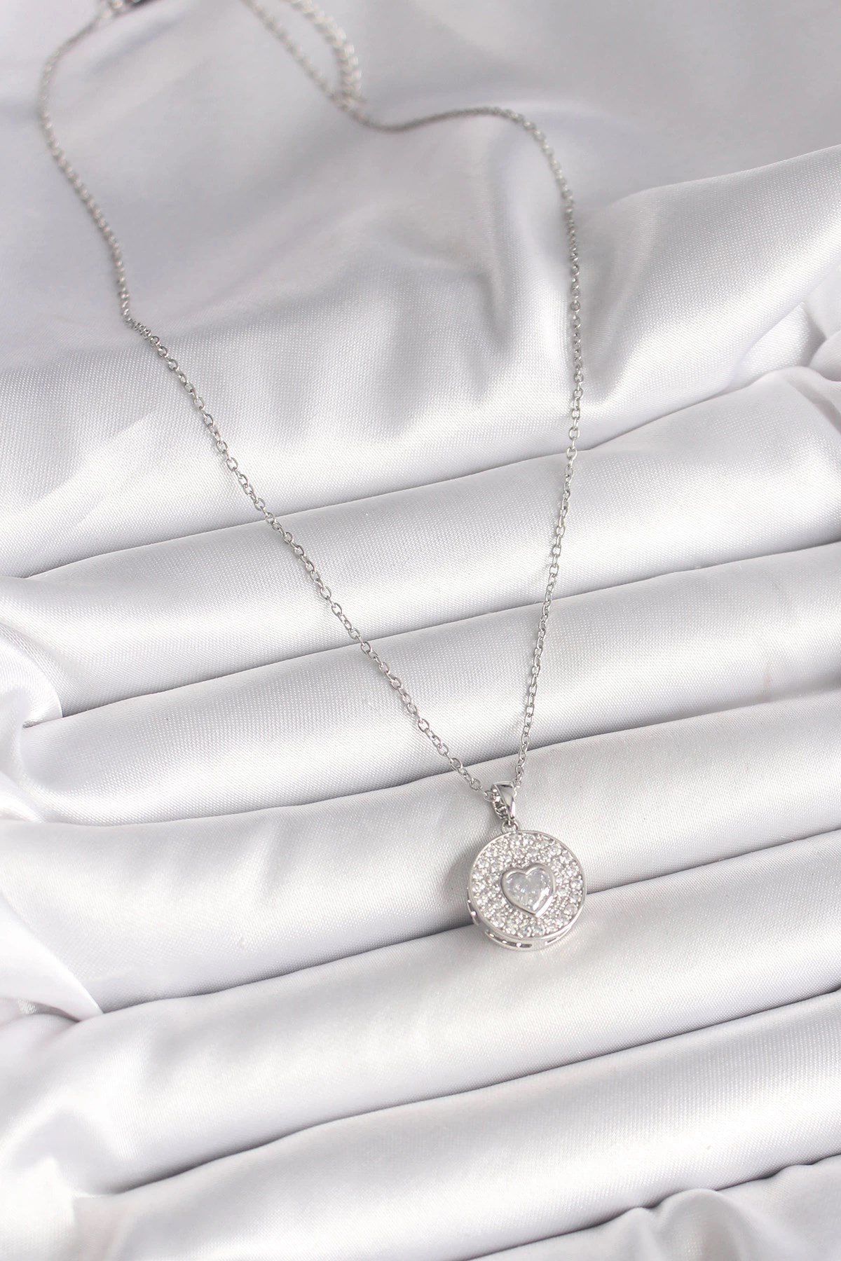 Mey İthalat® 316L Çelik Gümüş Renk Zincir Zirkon Taşlı Kalp İşlemeli Madalyon Model Kadın Kolye