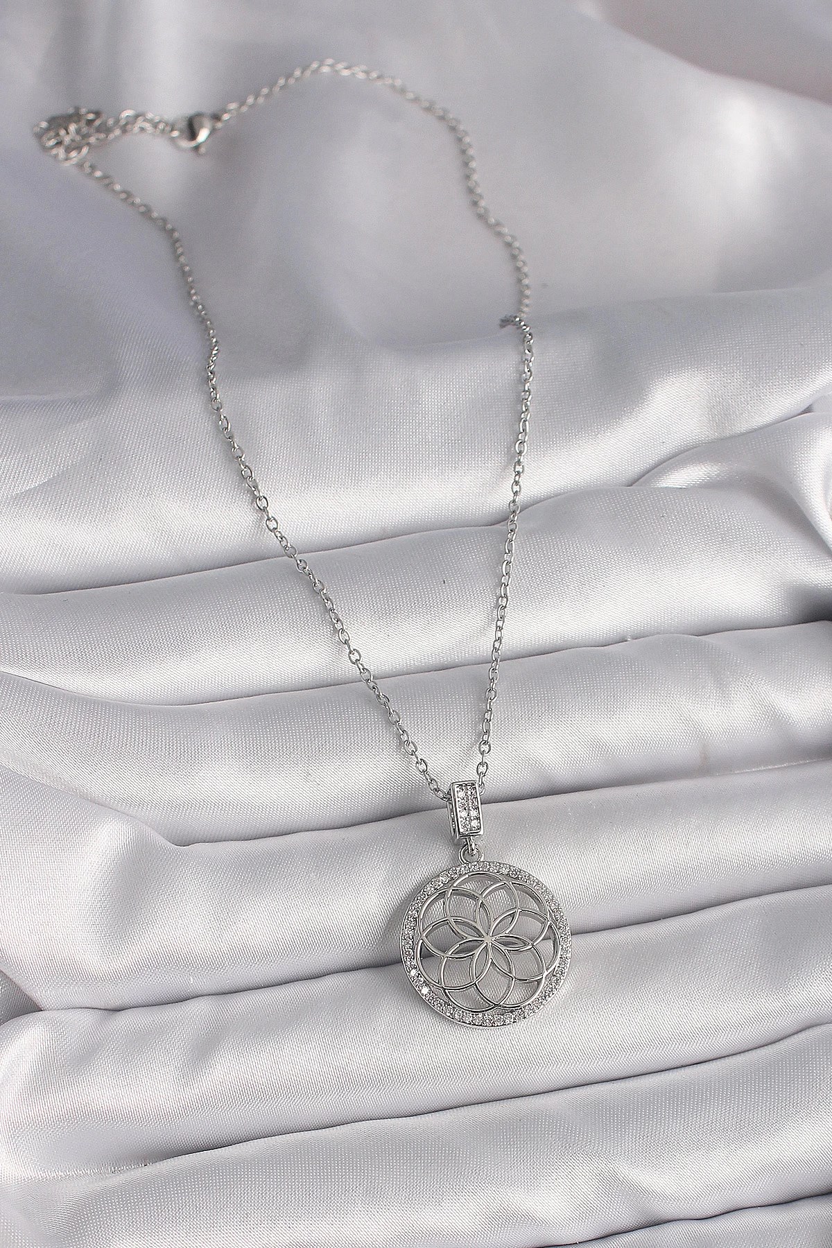 Mey İthalat® 316L Çelik Gümüş Renk Zincir Zirkon Taşlı Lotus Model Kadın Kolye