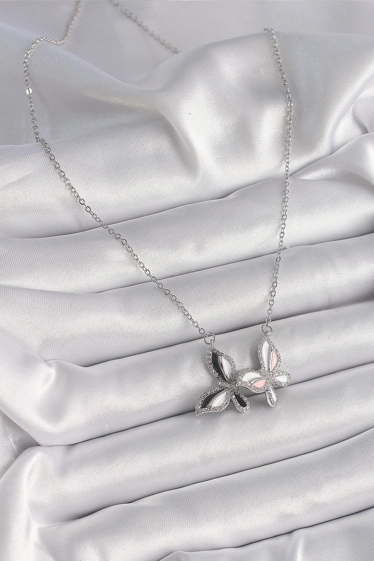 Mey İthalat® 316L Çelik Gümüş Renk Zincir Zirkon Taşlı Renkli Kelebek Model Kadın Kolye