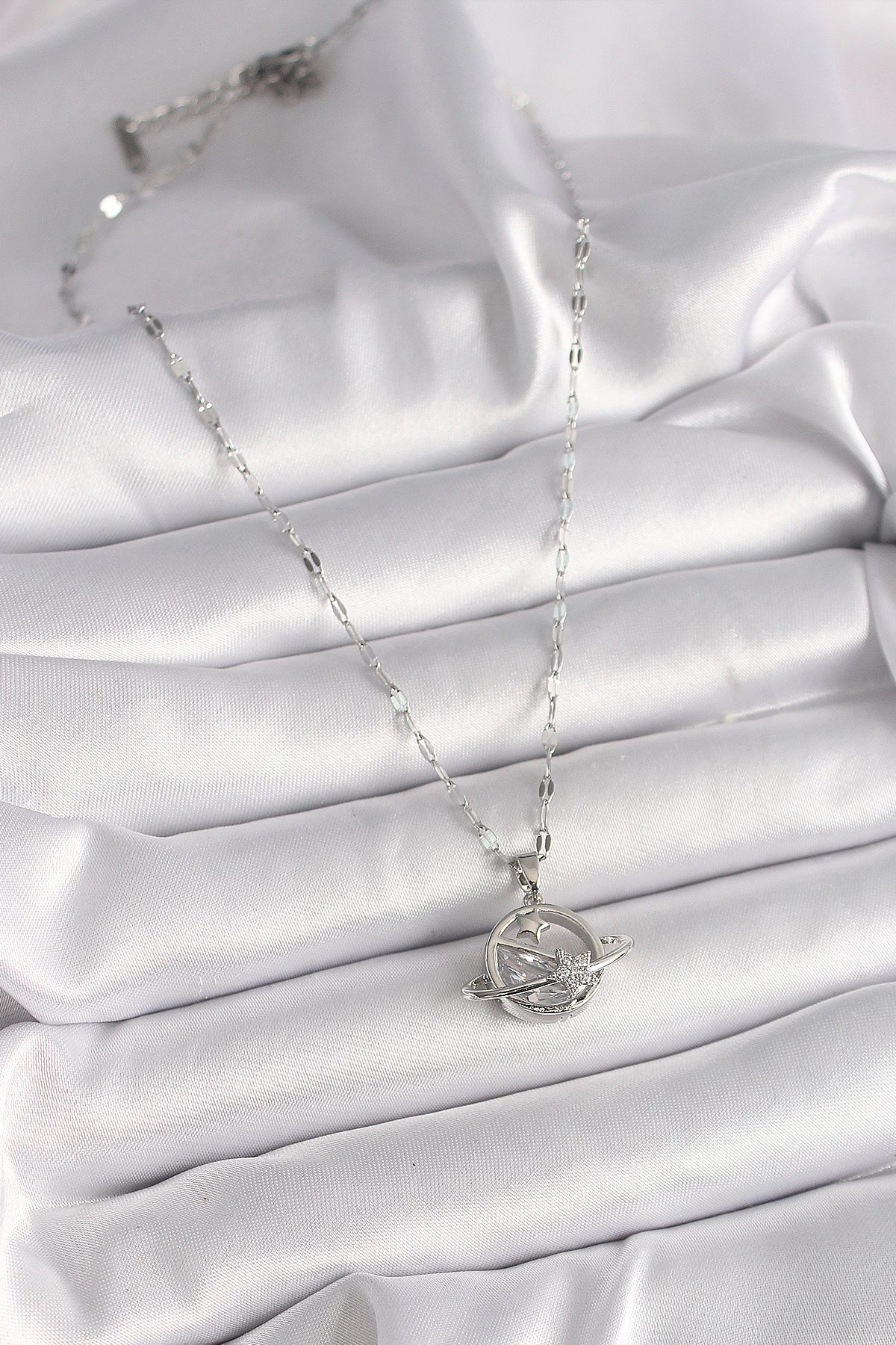 Mey İthalat® 316L Çelik Gümüş Renk Zincir Zirkon Taşlı Yıldız Detay Gezegen Model Kadın Kolye