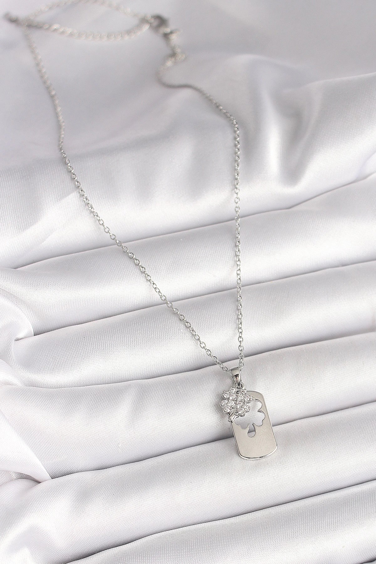 Mey İthalat® 316L Çelik Gümüş Renk Zincir Zirkon Taşlı Yonca Model Kadın Kolye