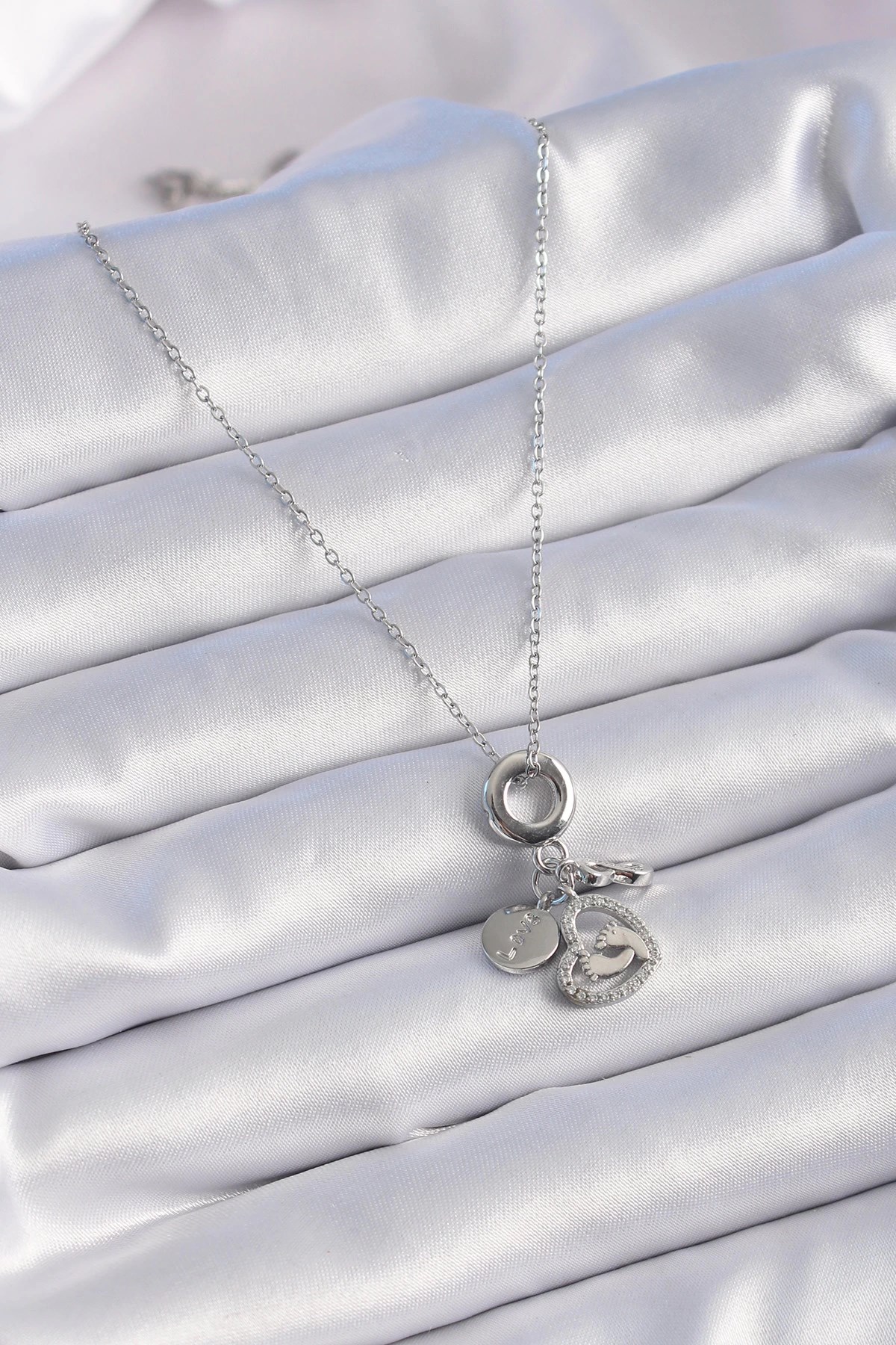 Mey İthalat® 316L Çelik Gümüş Renk Zirkon Taş Detay Kalp Model Charm Kadın Kolye