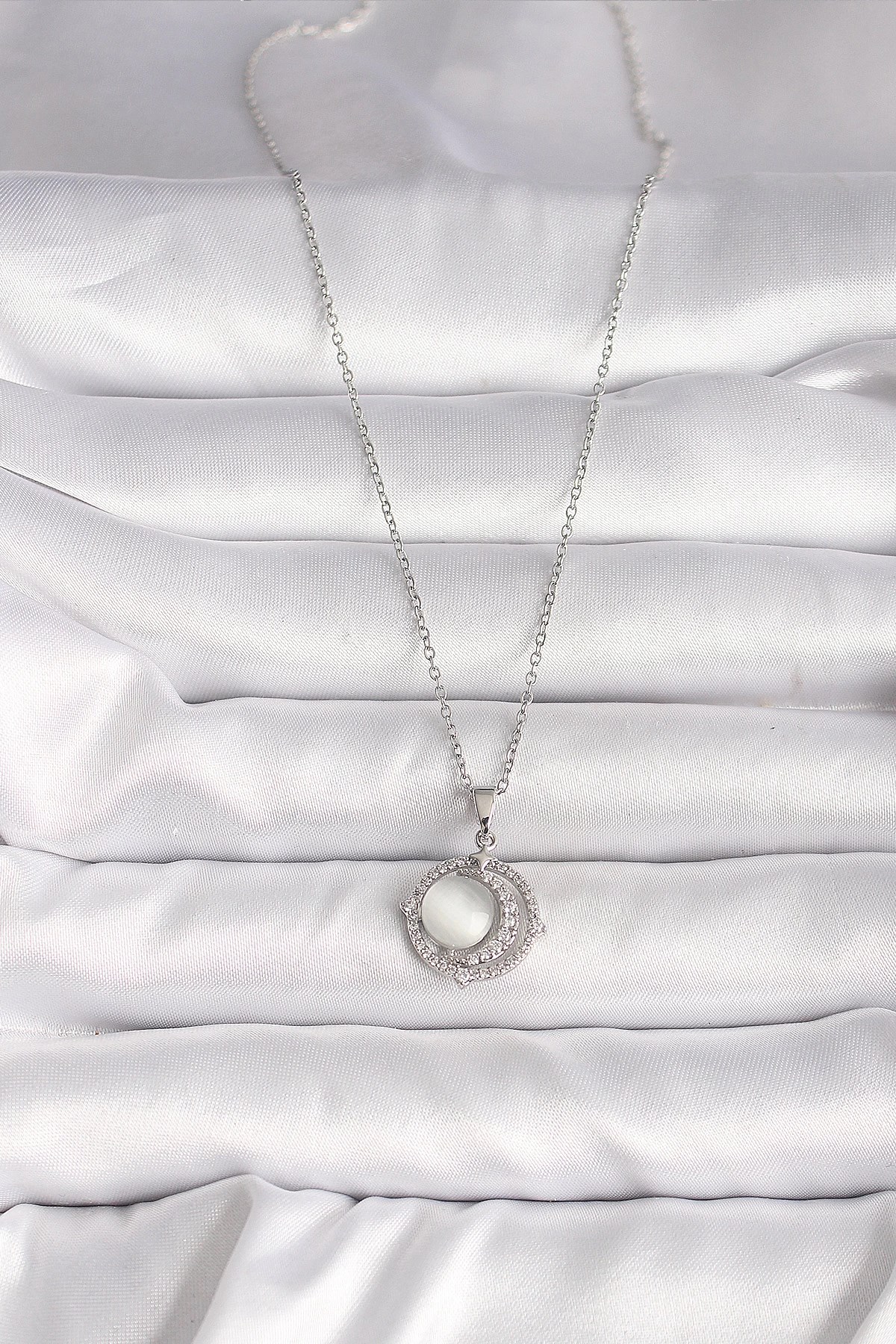 Mey İthalat® 316L Çelik Gümüş Renk Zirkon Taşlı Beyaz Sedefli Hilal Model Kadın Kolye