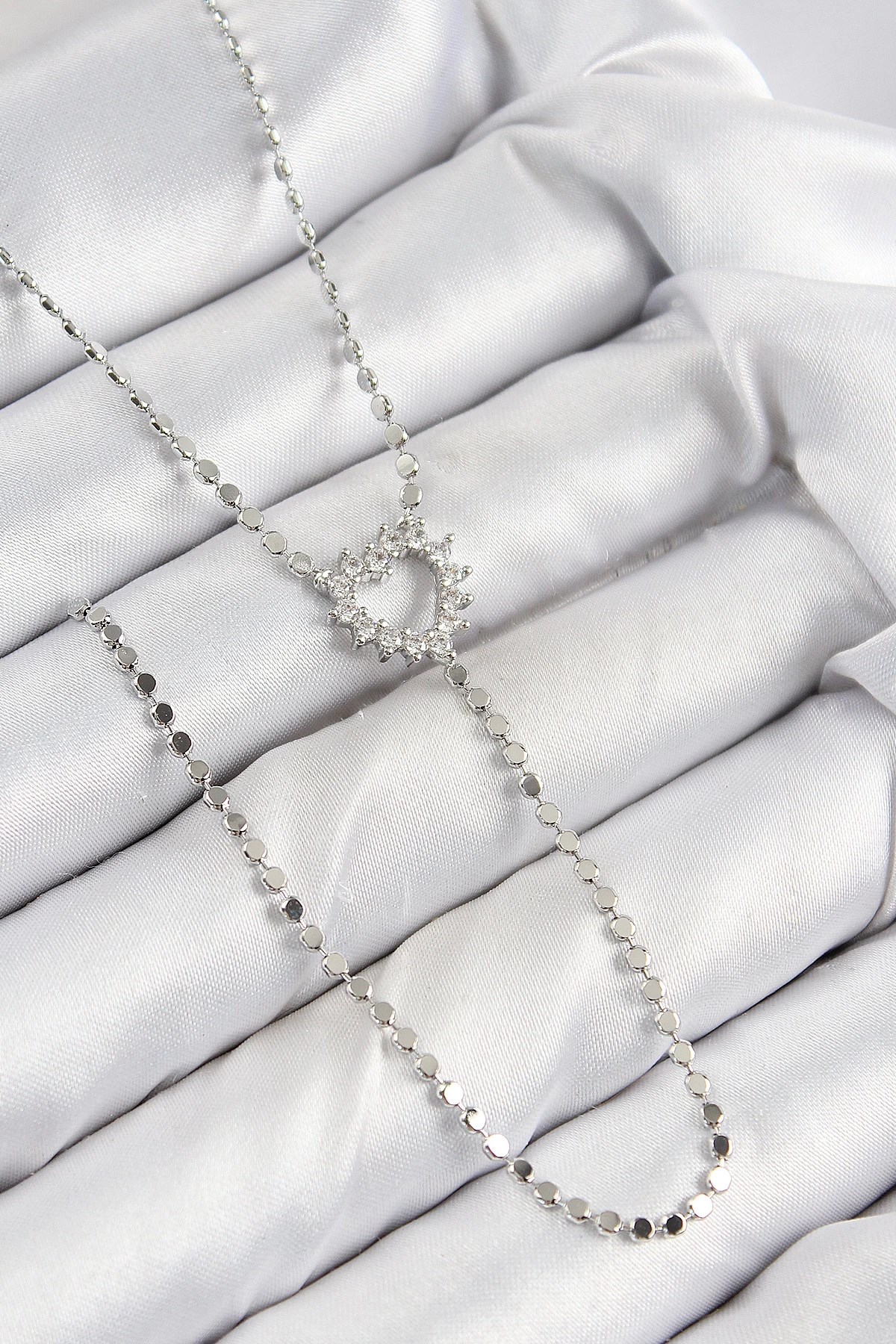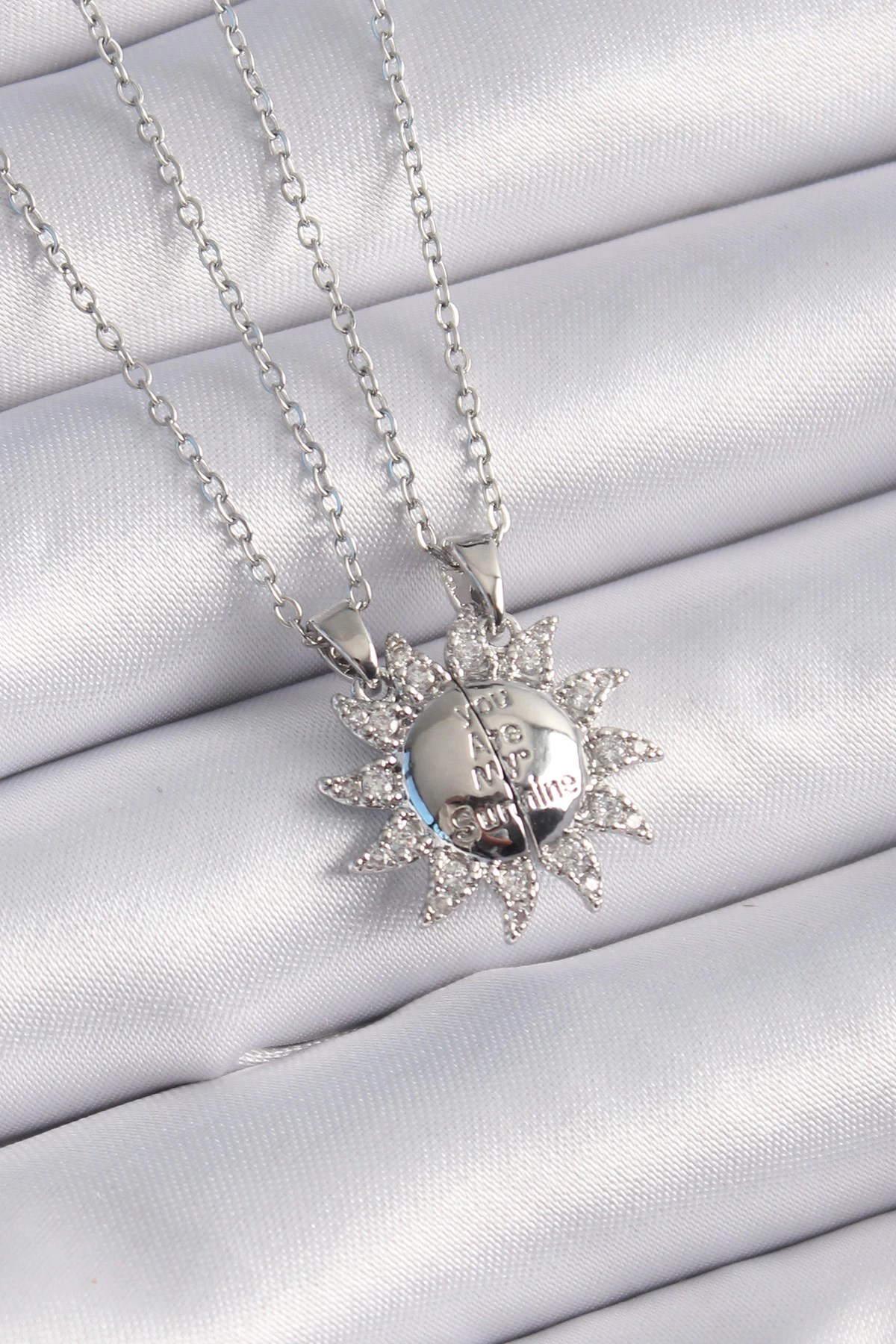 Mey İthalat® 316L Çelik Gümüş Renk Zirkon Taşlı Güneş Model İşleme Yazı Detay Arkadaşlık Kolyesi