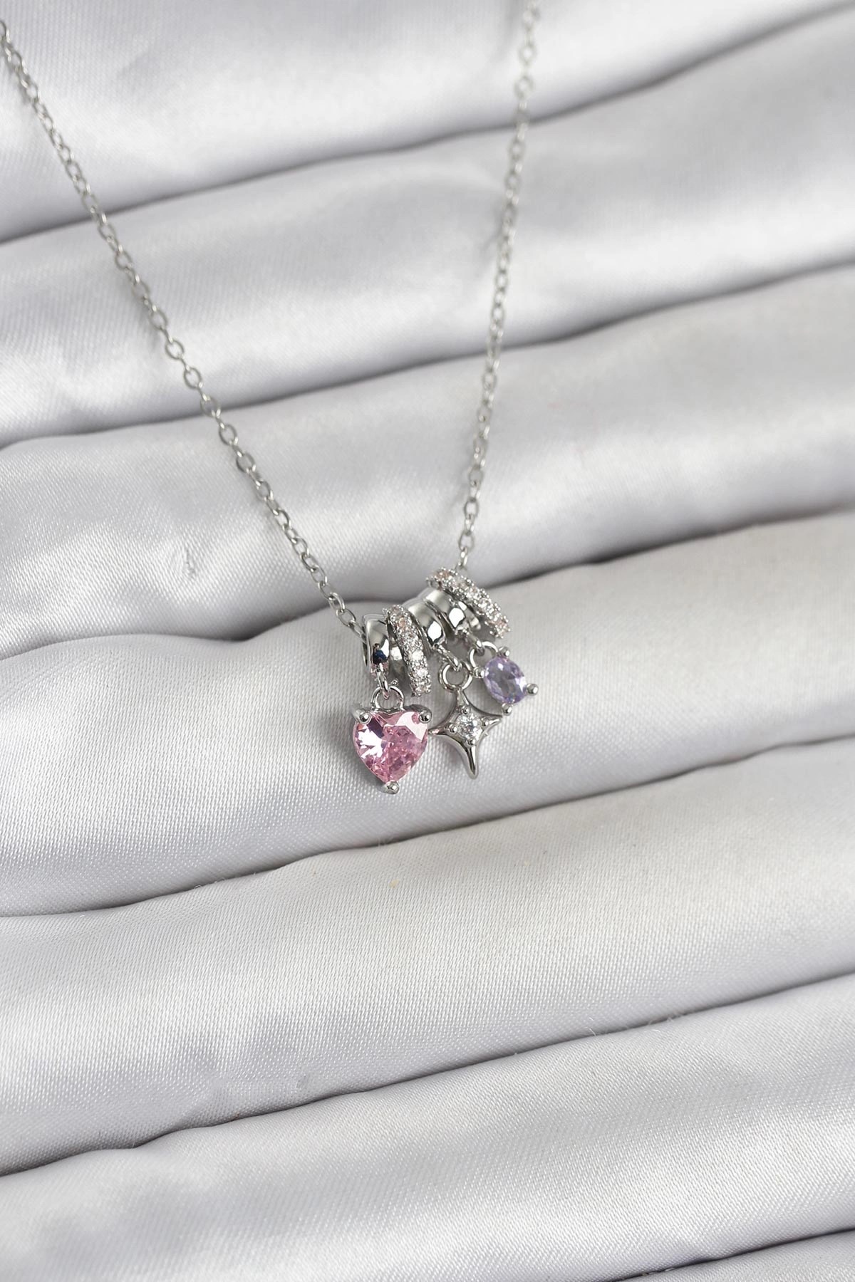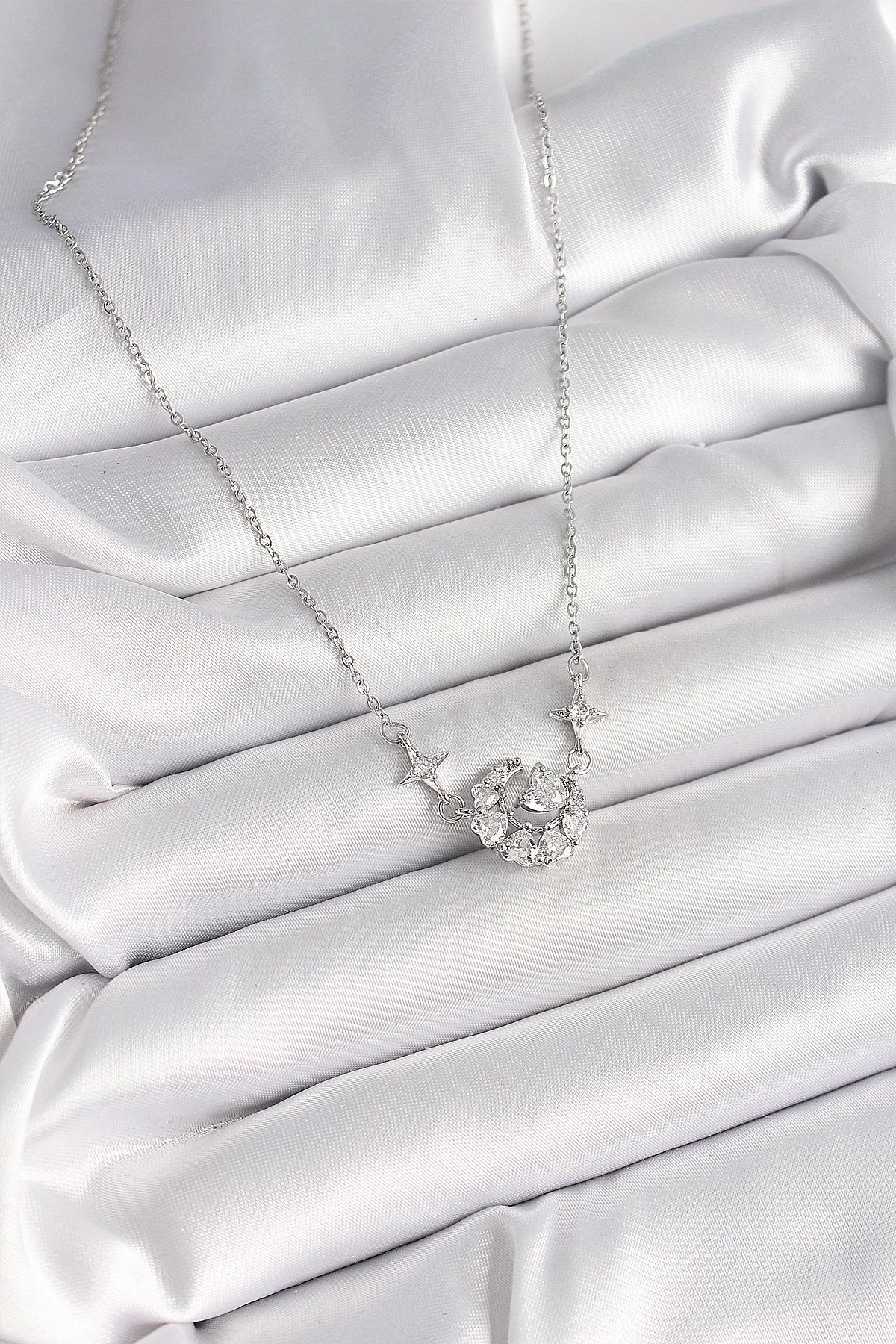 Mey İthalat® 316L Çelik Gümüş Renk Zirkon Taşlı Hilal Kalp Model Kadın Kolye