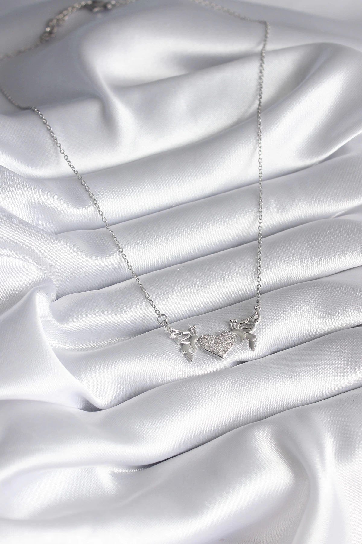 Mey İthalat® 316L Çelik Gümüş Renk Zirkon Taşlı Kanat Kalp Model Kadın Kolye