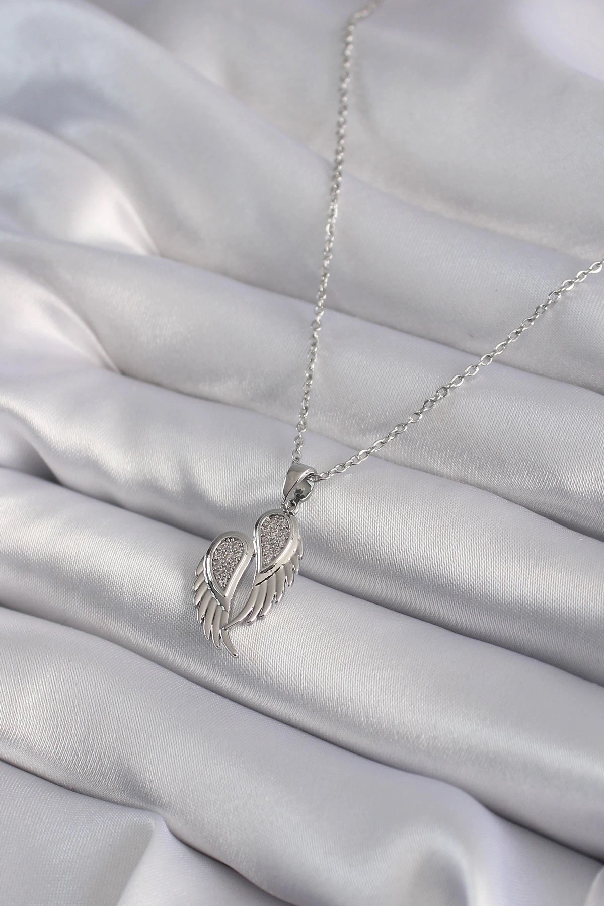 Mey İthalat® 316L Çelik Gümüş Renk Zirkon Taşlı Kanat Model Kadın Kolye