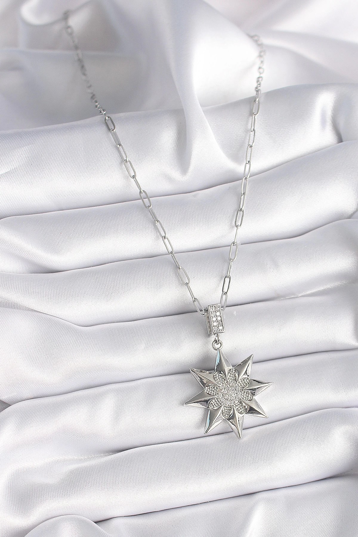 Mey İthalat® 316L Çelik Gümüş Renk Zirkon Taşlı Kutup Yıldızı Model Kadın Kolye