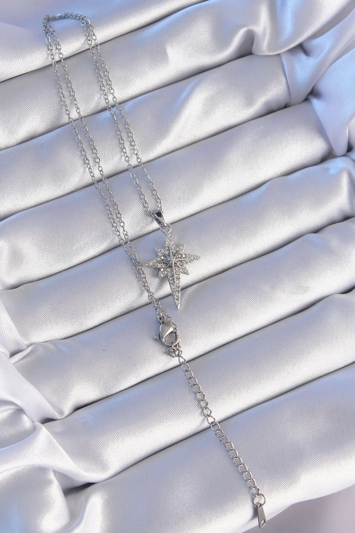 Mey İthalat® 316L Çelik Gümüş Renk Zirkon Taşlı Kutup Yıldızı Model Kolye