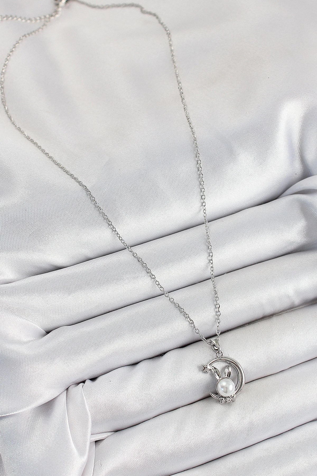 Mey İthalat® 316L Çelik İnci Detaylı Hilal Tavşan Model Gümüş Renk Kadın Kolye