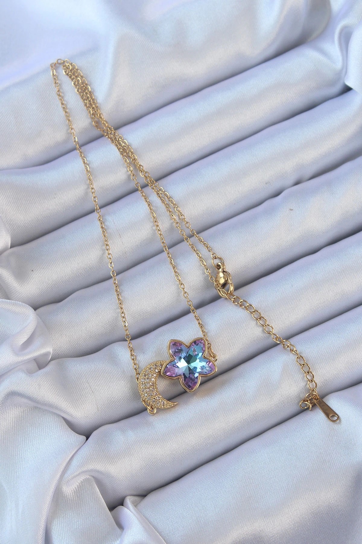 Mey İthalat® 316L Çelik Zincir Altın Renk Ay Tasarımlı Renkli Zirkon Taşlı Çiçek Kolye