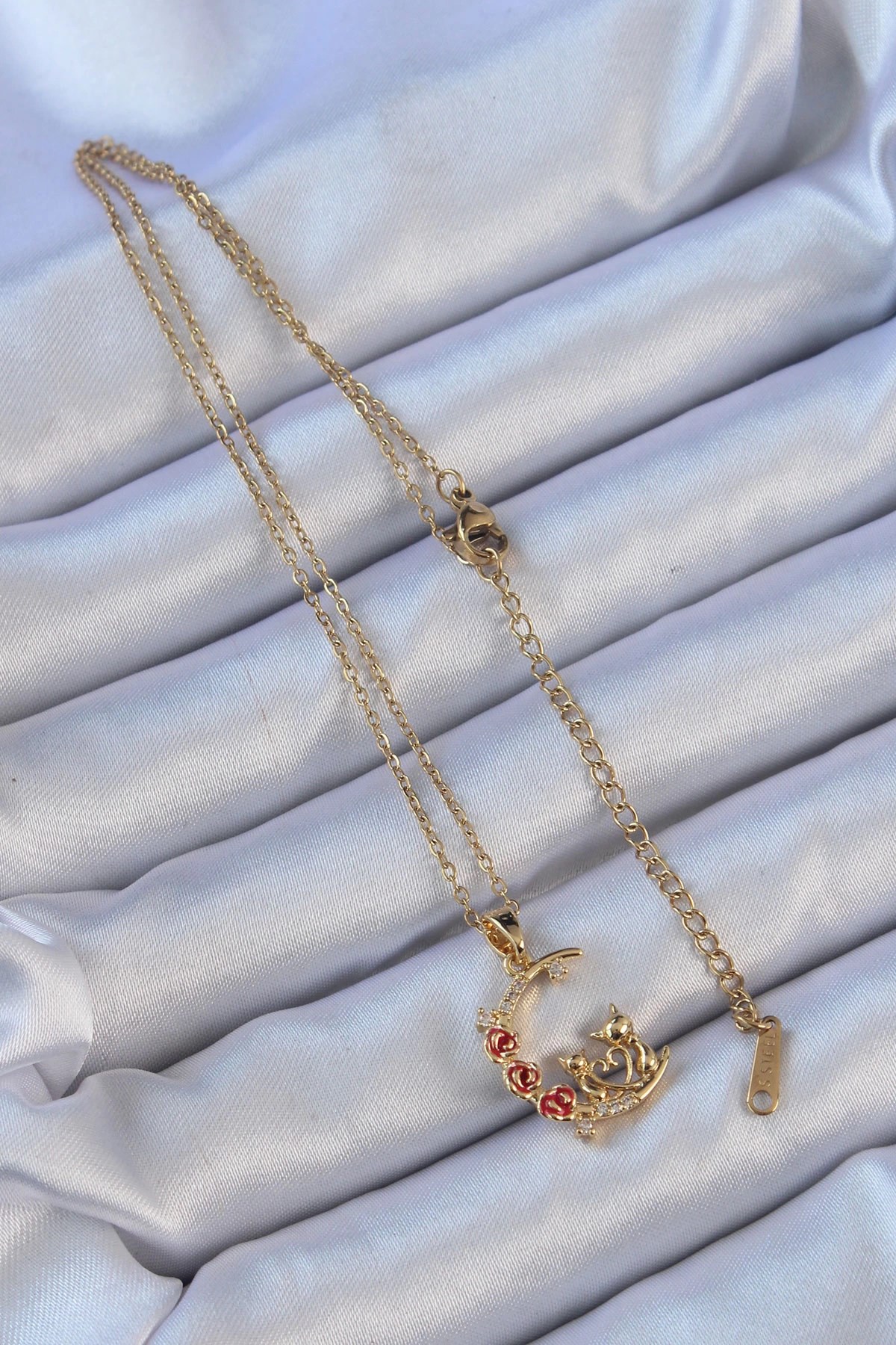 Mey İthalat® 316L Çelik Zincir Altın Renk Kırmızı Gül Detay Kedi Figür Zirkon Taşlı Ay Kolye