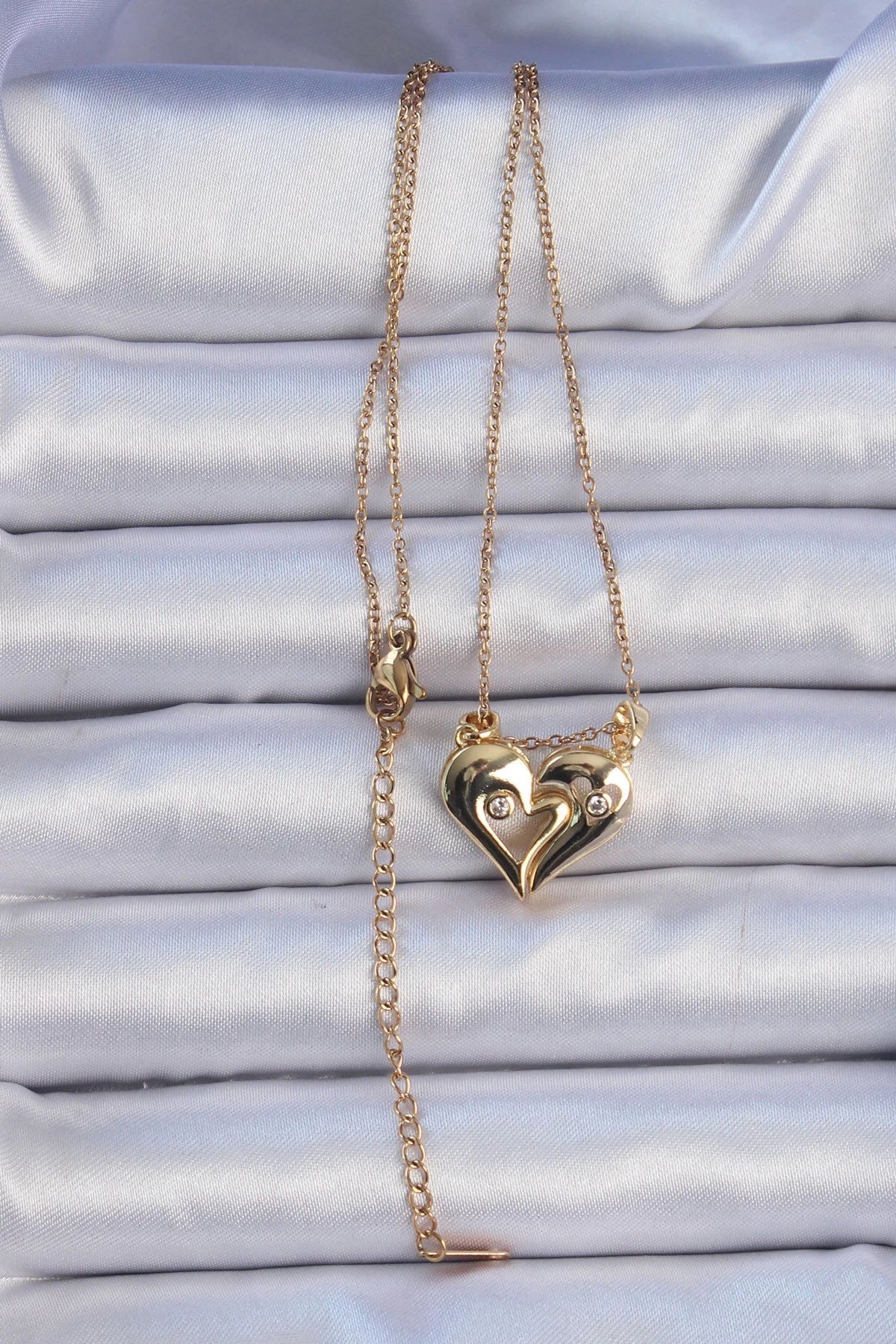 Mey İthalat® 316L Çelik Zincir Altın Renk Zirkon Taşlı Mıknatıslı Kalp Kolye