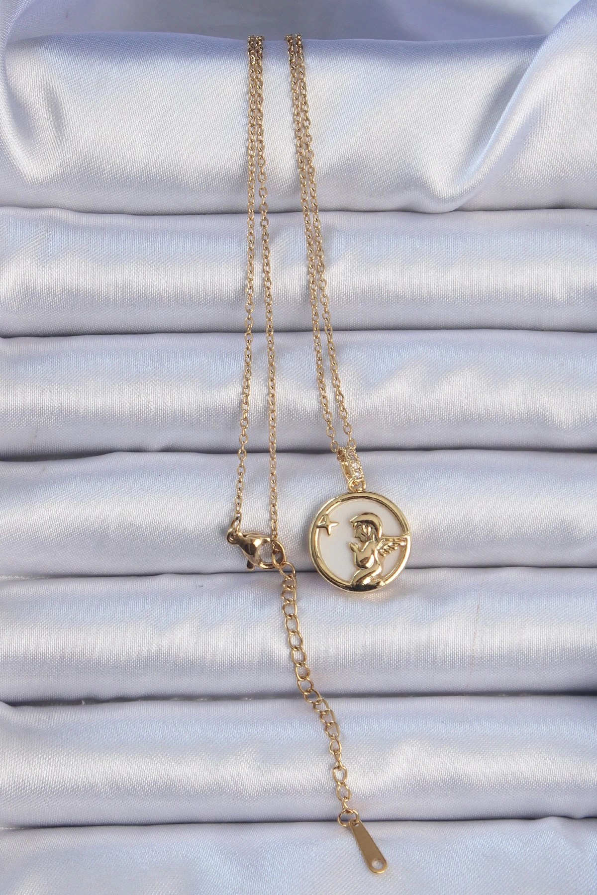 Mey İthalat® 316L Çelik Zincir Altın Renk Zirkon Taşlı Mineli Melek Kolye
