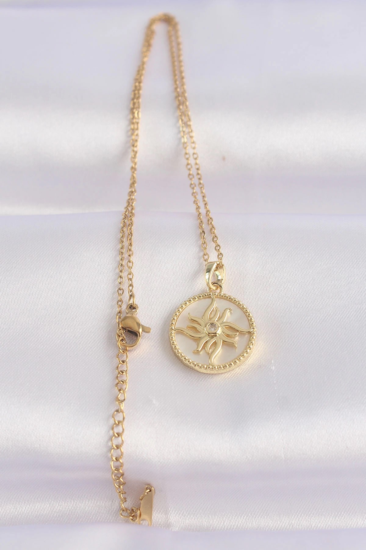 Mey İthalat® 316L Çelik Zincir Altın Renk Zirkon Taşlı Oval Tasarım Güneş Kolye