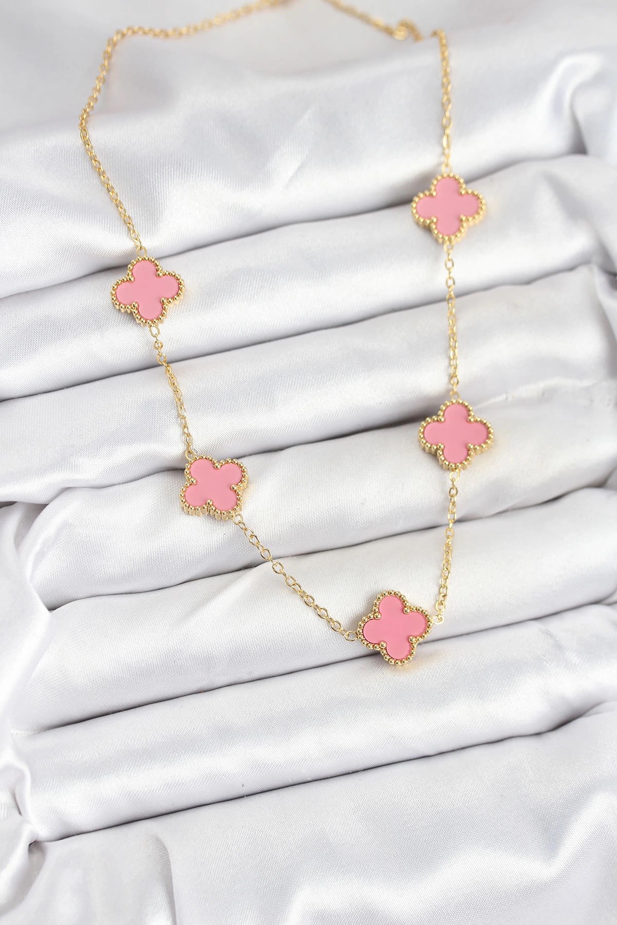Mey İthalat® 316L Çelik Zincir Gold Pembe Renk Yonca Kadın Kolye