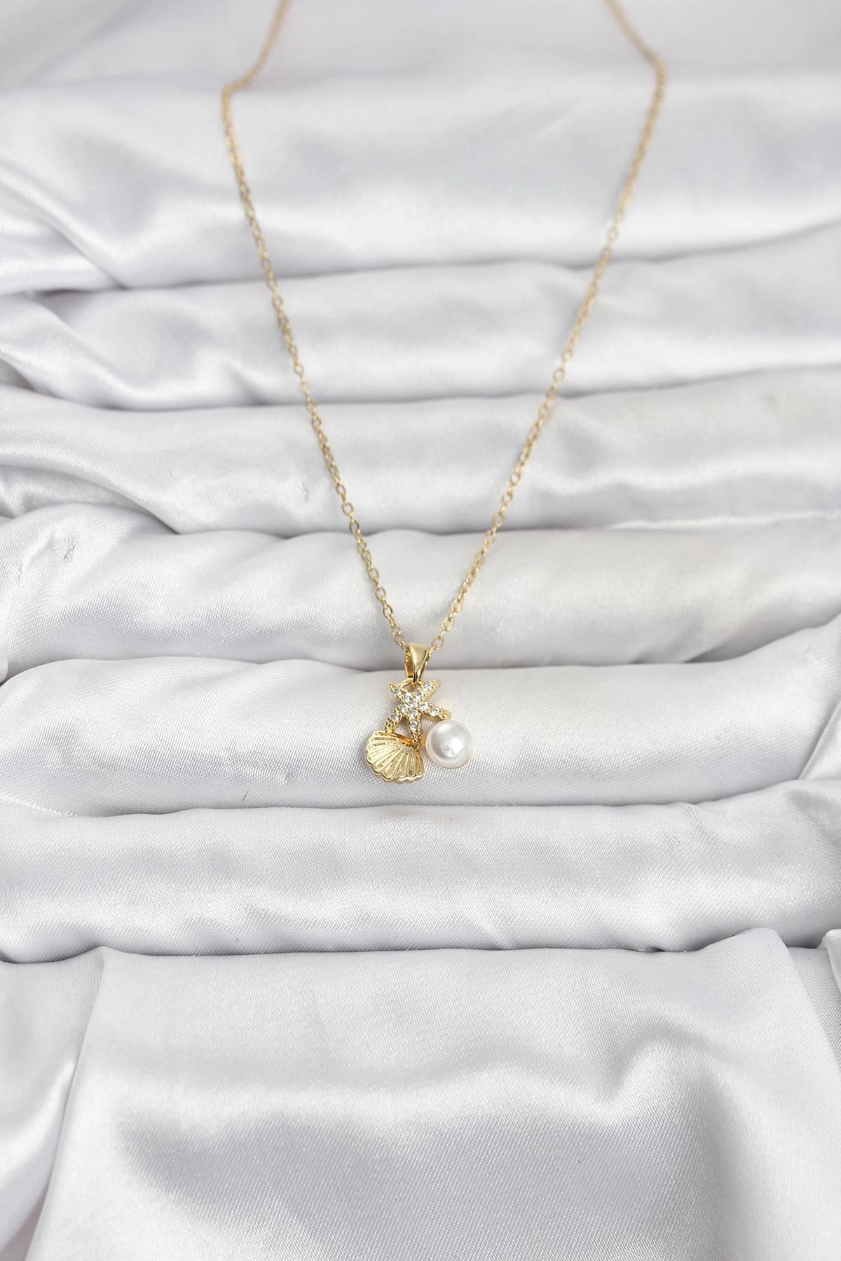 Mey İthalat® 316L Çelik Zincir Gold Renk Deniz Kabuğu ve Deniz Yıldızı Model Zirkon Taşlı Kadın Kolye
