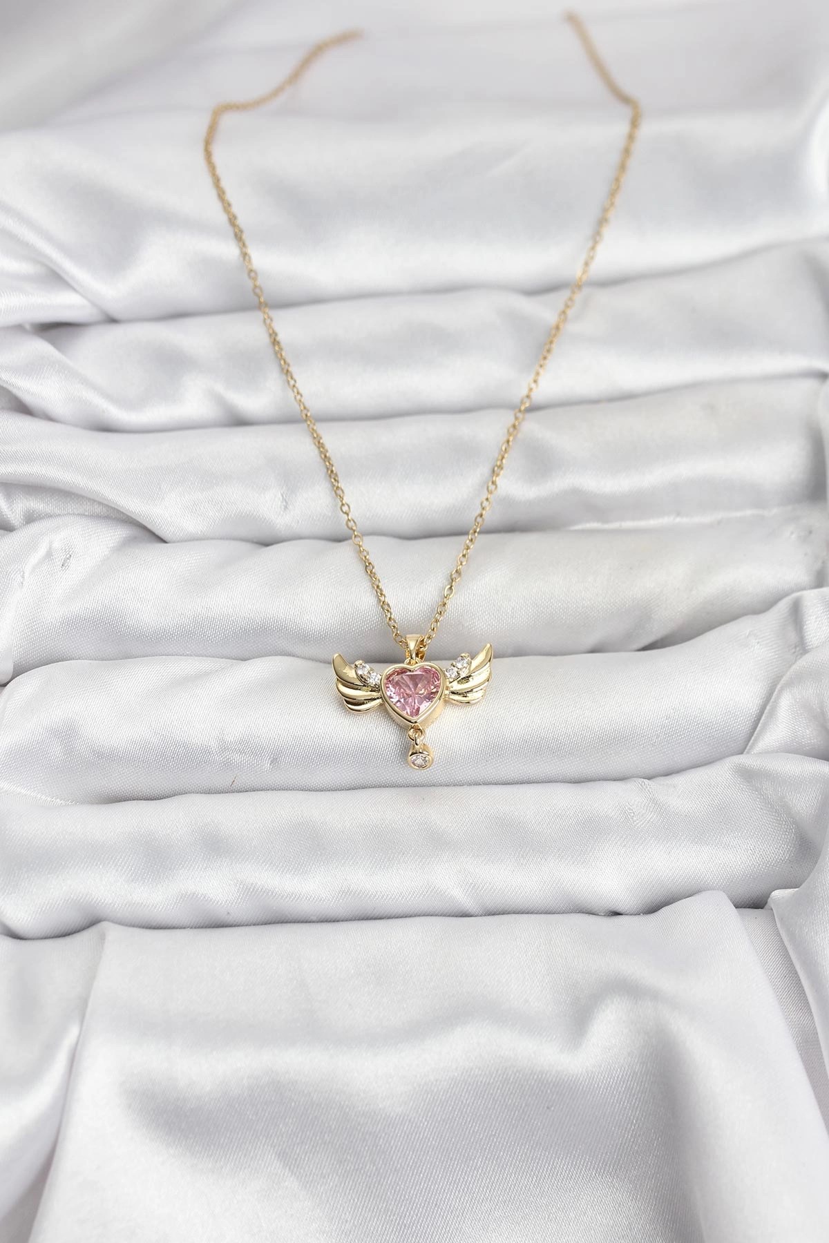 Mey İthalat® 316L Çelik Zincir Gold Renk Kanatlı Kalp Model Zirkon Taşlı Kadın Kolye