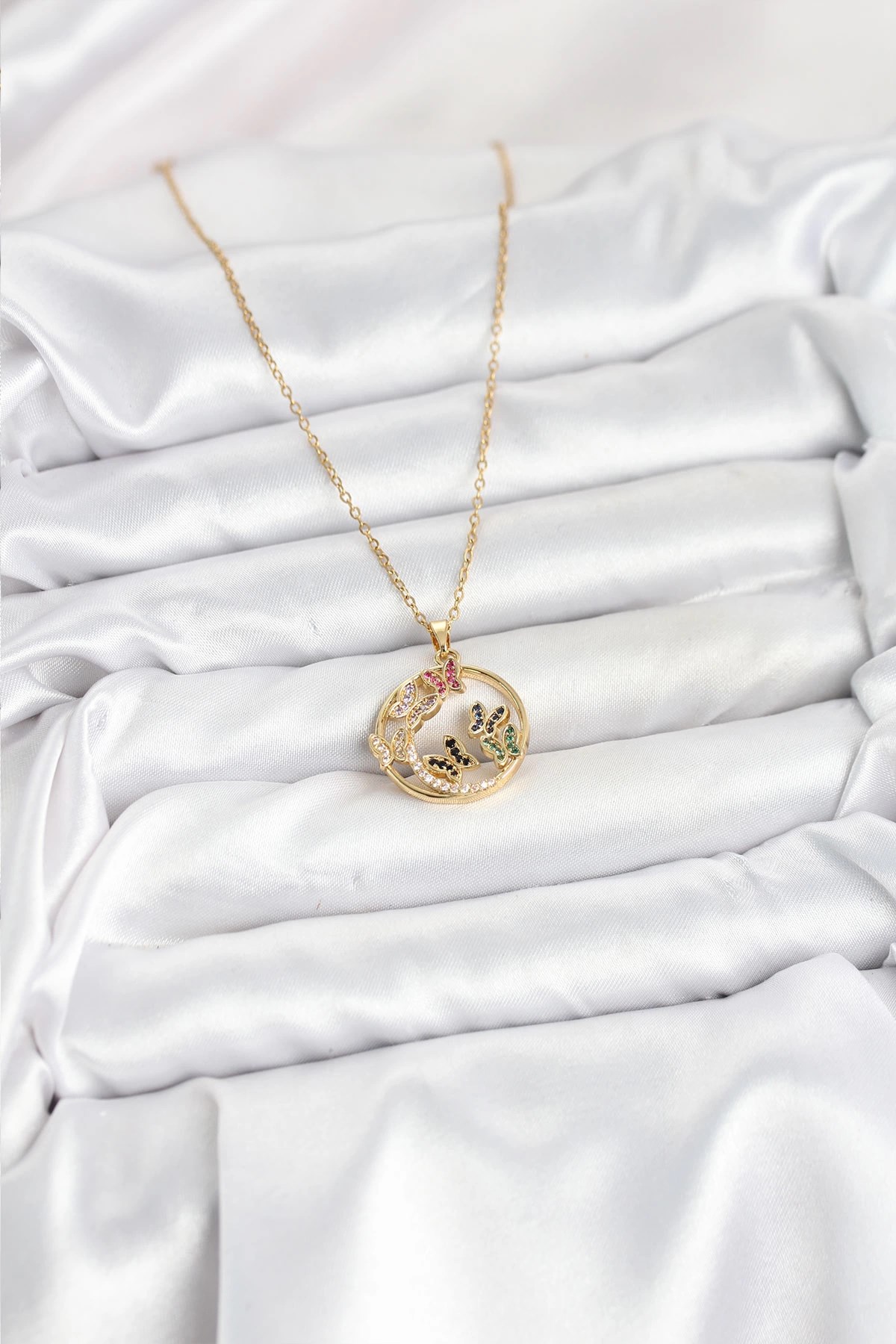Mey İthalat® 316L Çelik Zincir Gold Renk Zirkon Taşlı Kelebekli Kadın Kolye