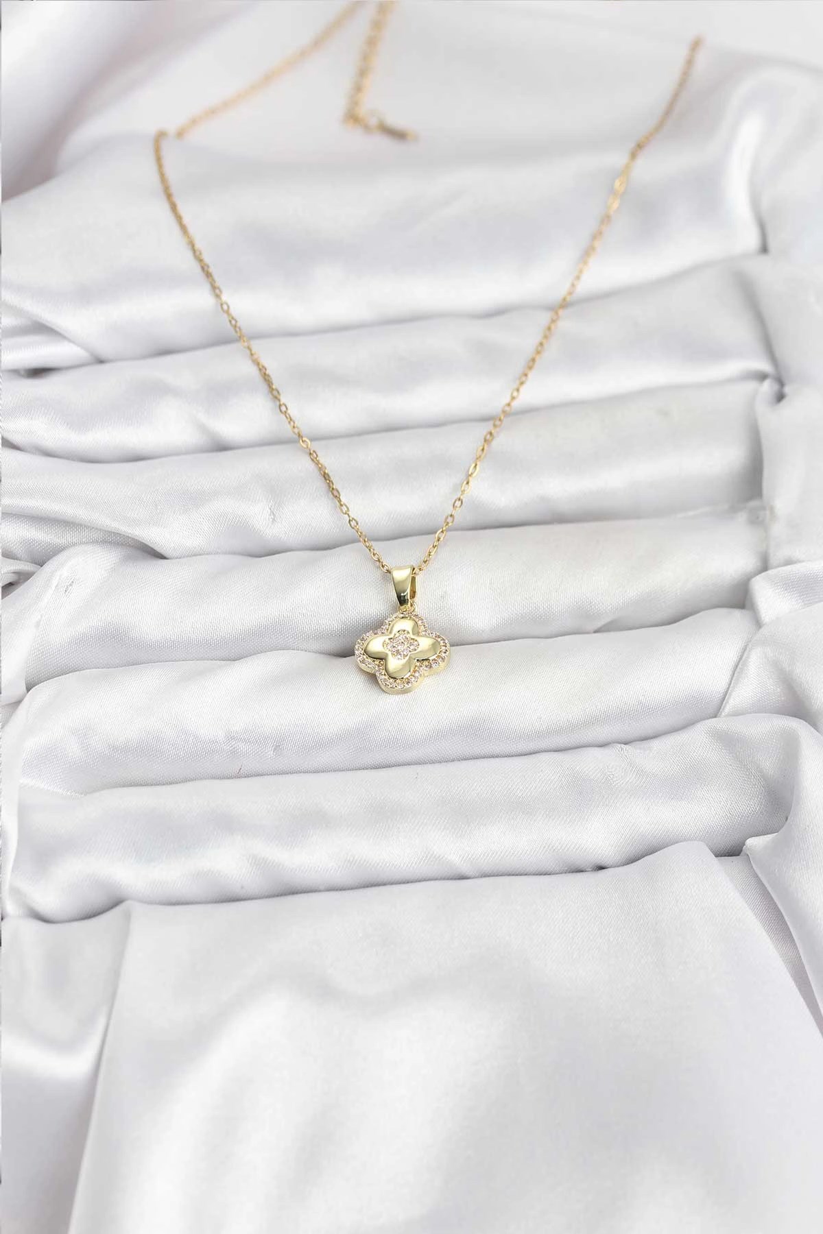 Mey İthalat® 316L Çelik Zincir Gold Renk Zirkon Taşlı Yonca Model Kadın Kolye