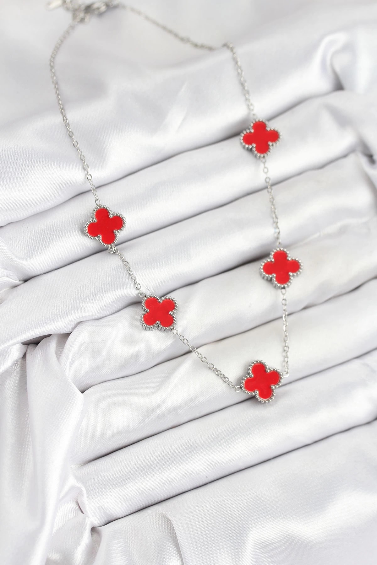 Mey İthalat® 316L Çelik Zincir Gümüş Kırmızı Renk Yonca Kadın Kolye