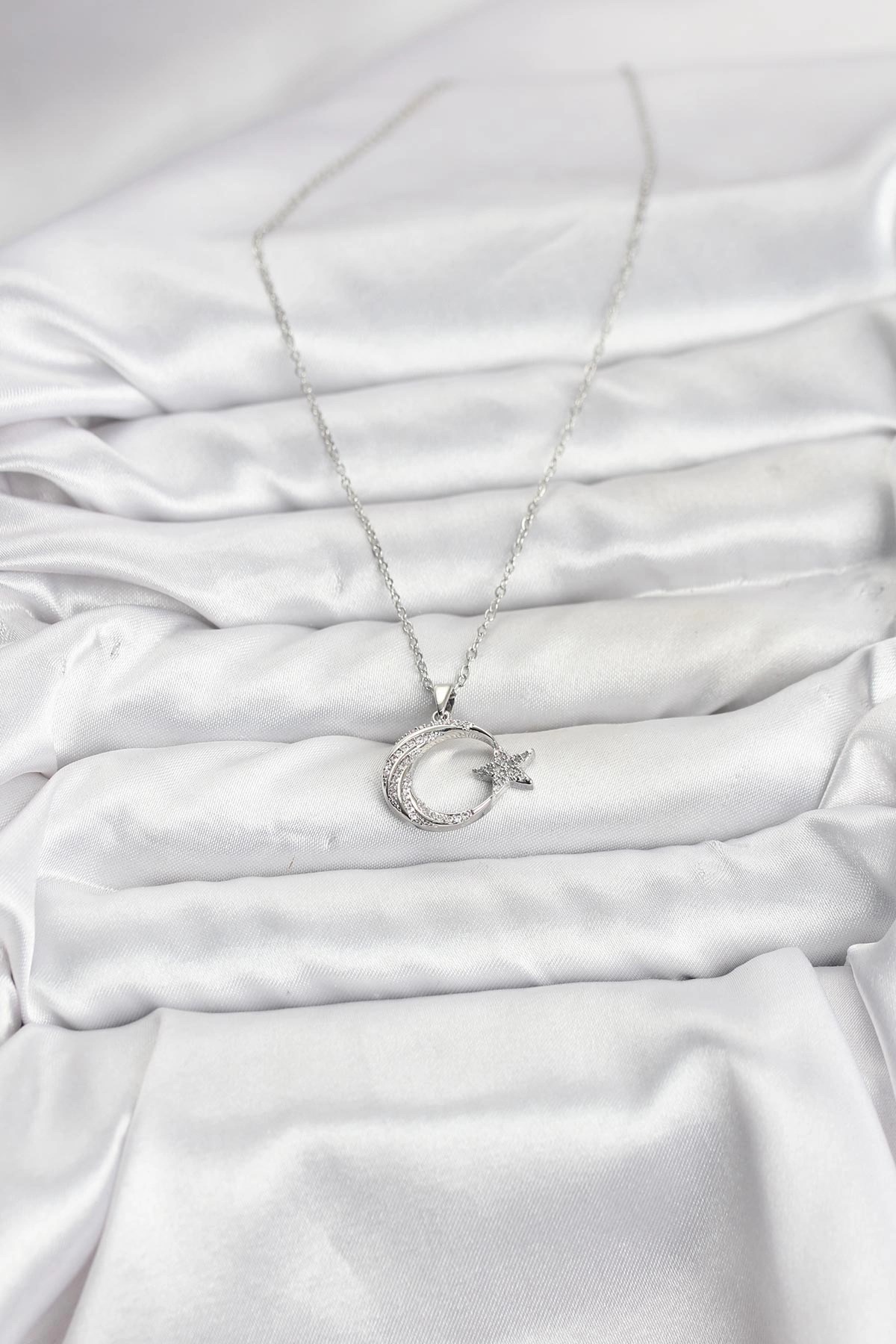 Mey İthalat® 316L Çelik Zincir Gümüş Renk Ay Yıldız Model Zirkon Taşlı Kadın Kolye