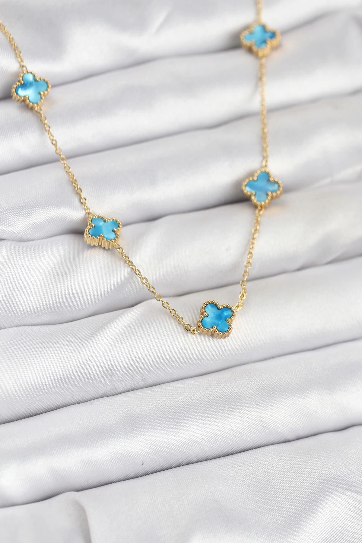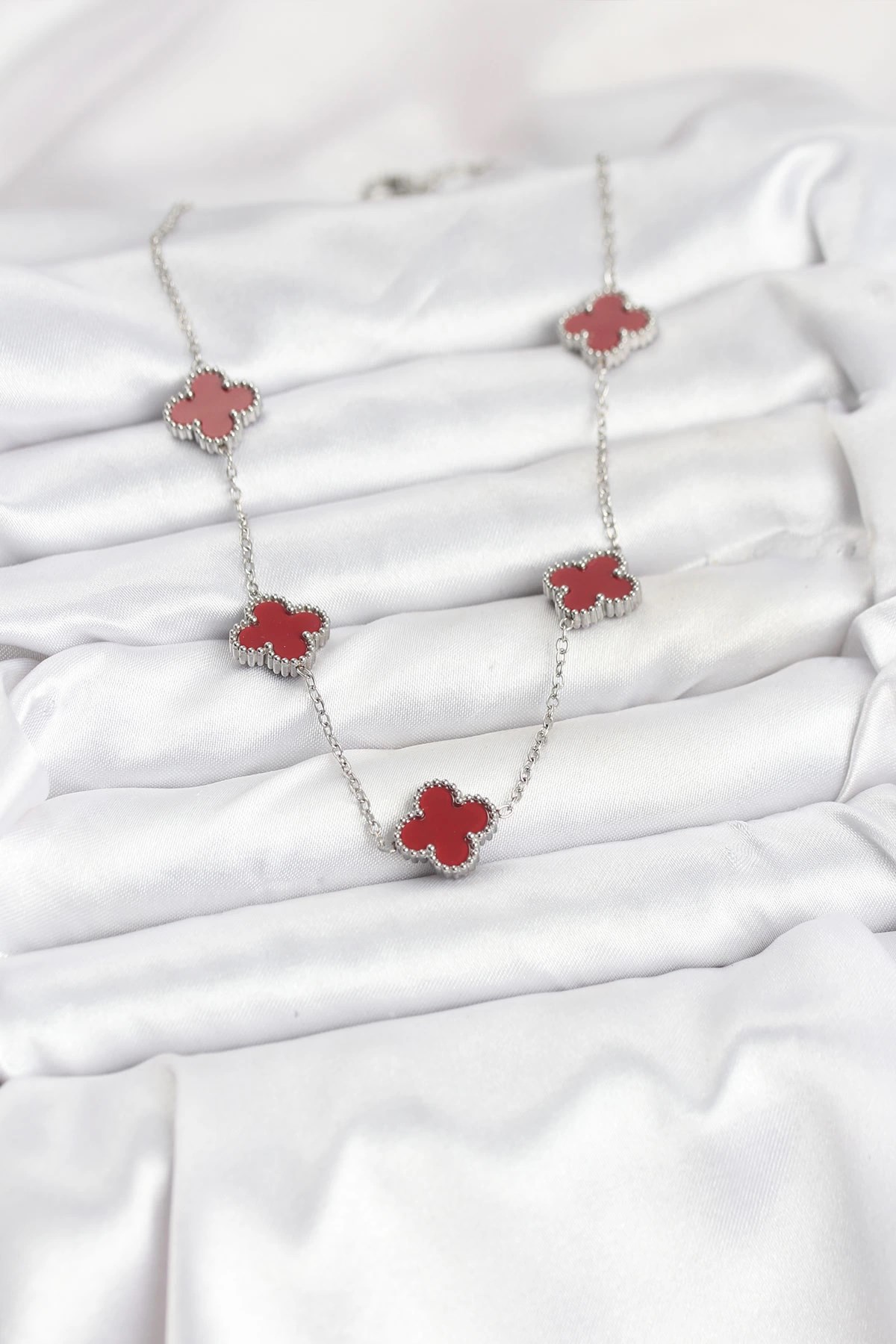 Mey İthalat® 316L Çelik Zincir Gümüş Renk Bordo Renk Yonca Kadın Kolye