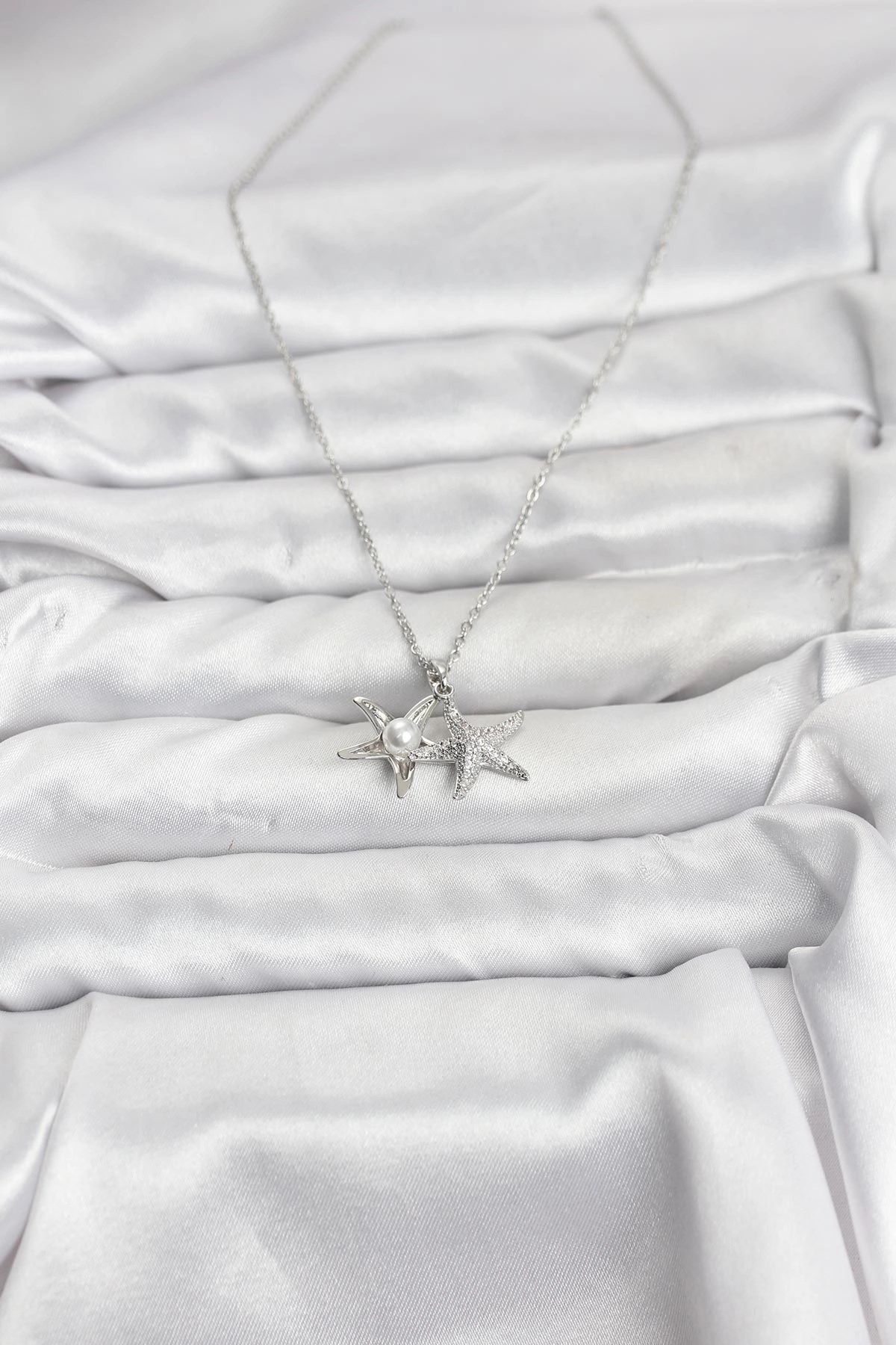 Mey İthalat® 316L Çelik Zincir Gümüş Renk Deniz Yıldızı Model Zirkon Taşlı Kadın Kolye