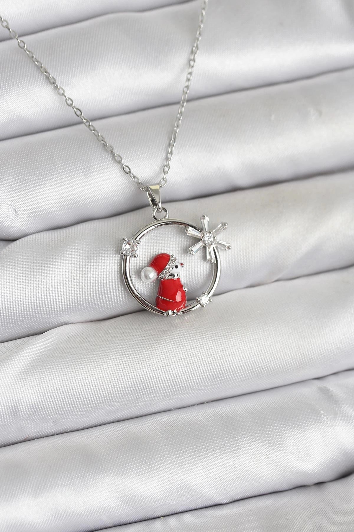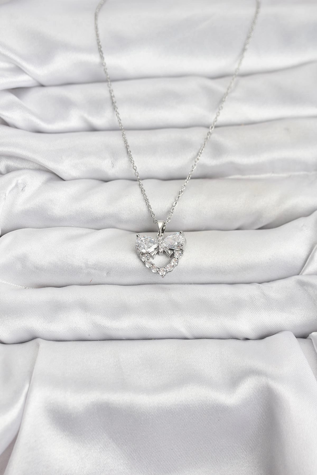 Mey İthalat® 316L Çelik Zincir Gümüş Renk Kalp ve Fiyonk Model Zirkon Taşlı Kadın Kolye