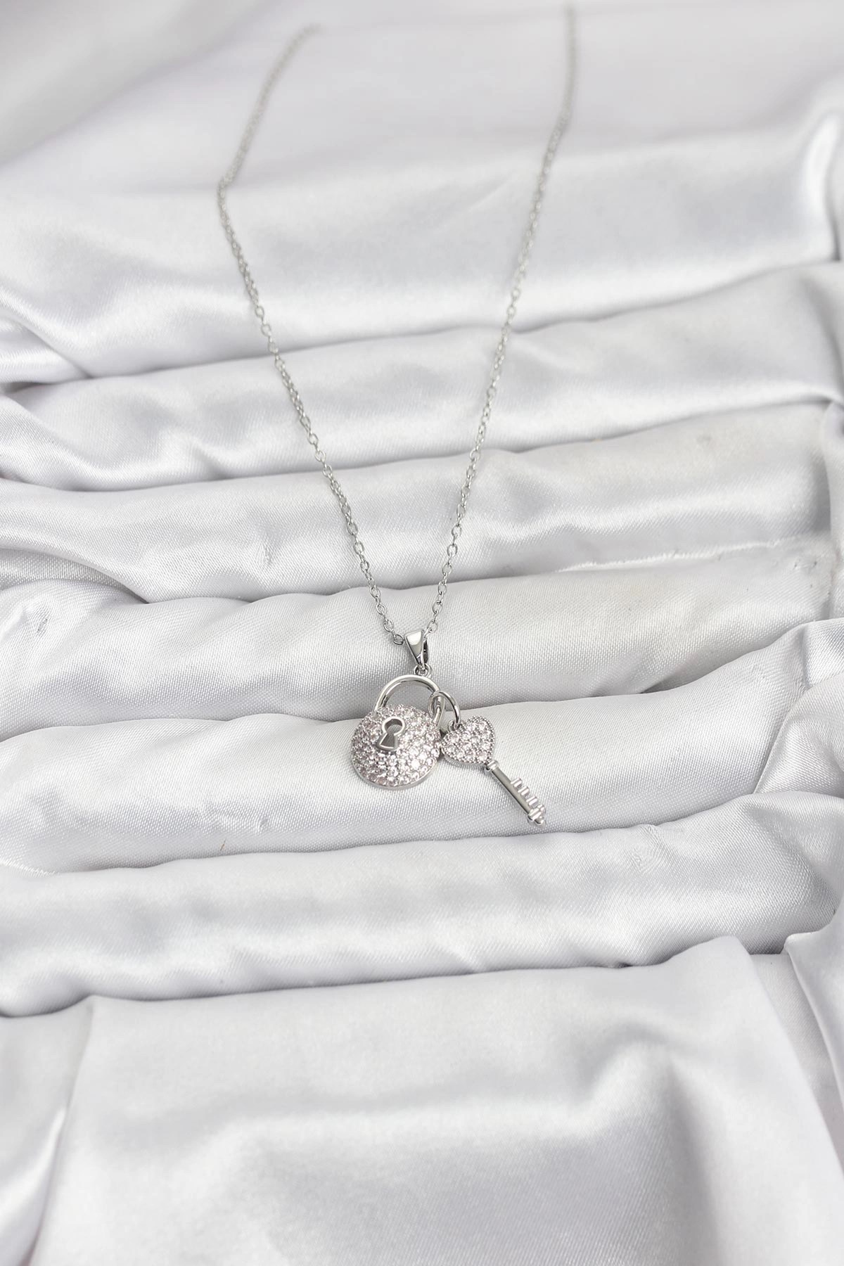 Mey İthalat® 316L Çelik Zincir Gümüş Renk Kilit Anahtar Model Zirkon Taşlı Kadın Kolye