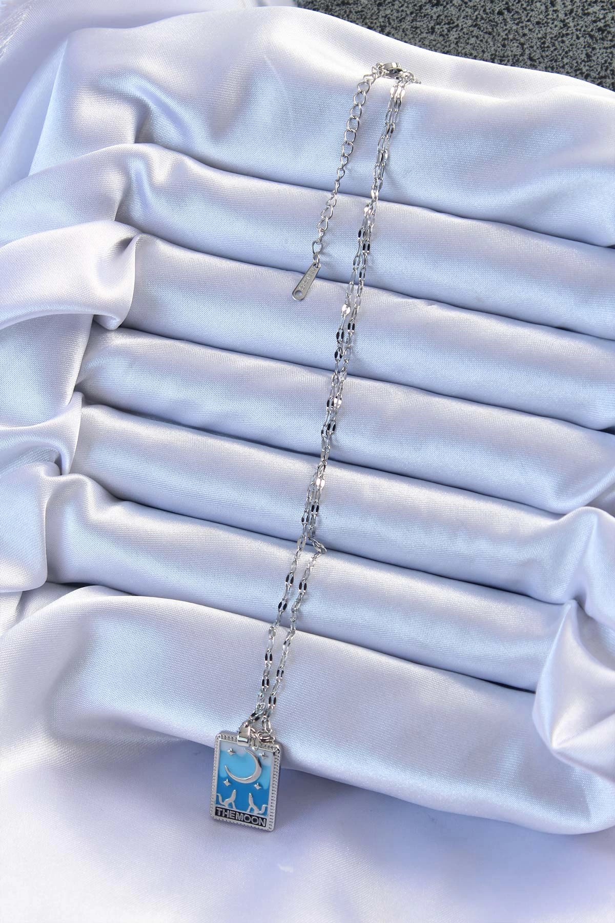 Mey İthalat® 316L Çelik Zincir Gümüş Renk Mavi Mineli Ay Figür Tarot Kolye