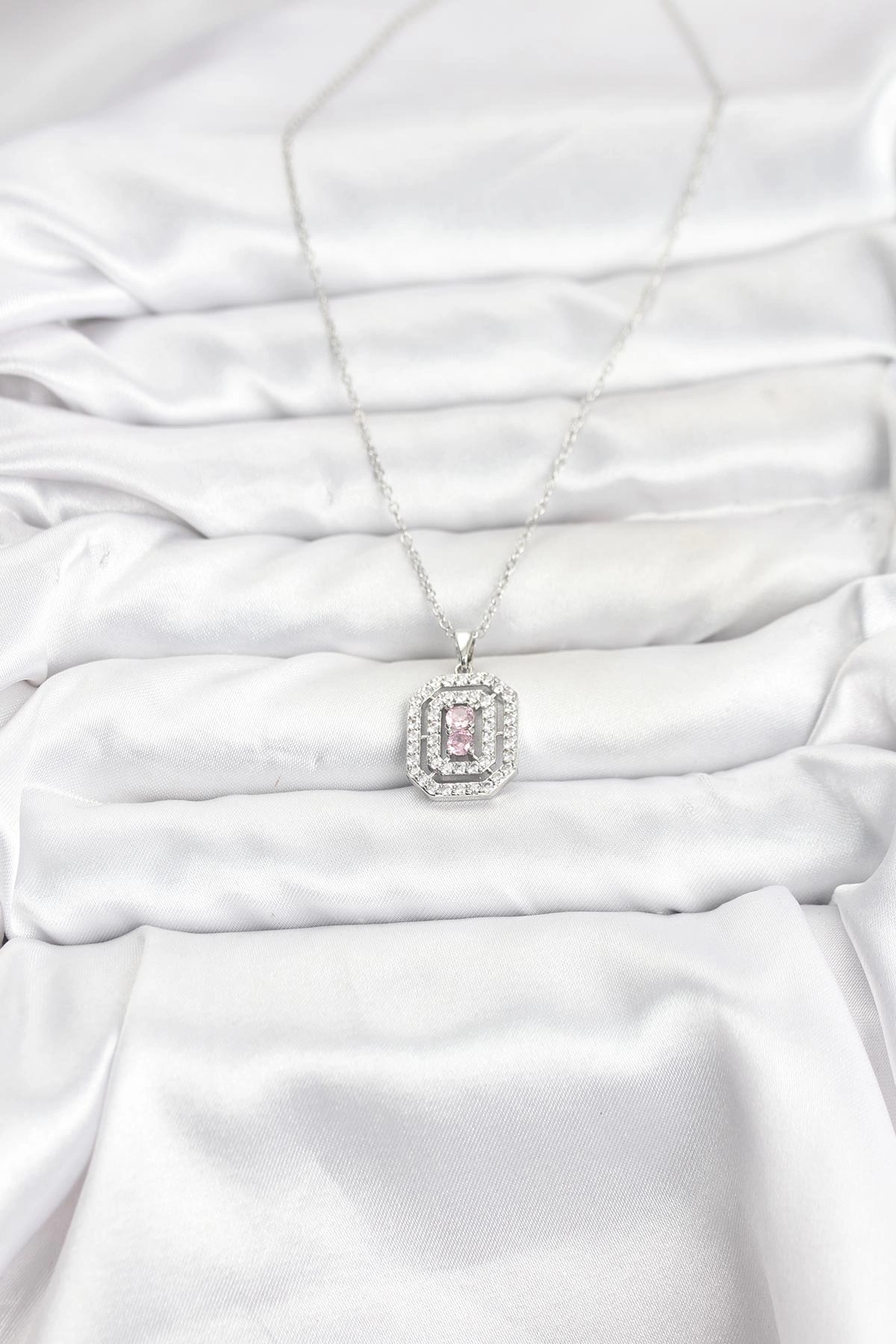 Mey İthalat® 316L Çelik Zincir Gümüş Renk Plaka Model Zirkon Taşlı Kadın Kolye