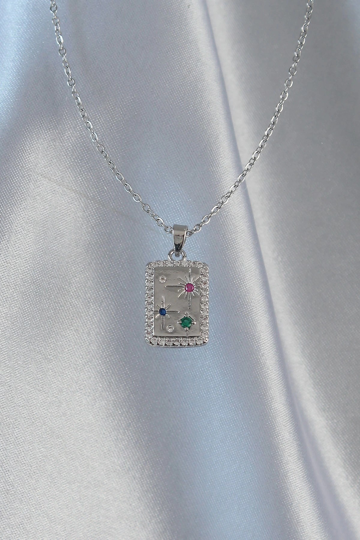 Mey İthalat® 316L Çelik Zincir Gümüş Renk Renkli Zirkon Taşlı Vintage Kolye
