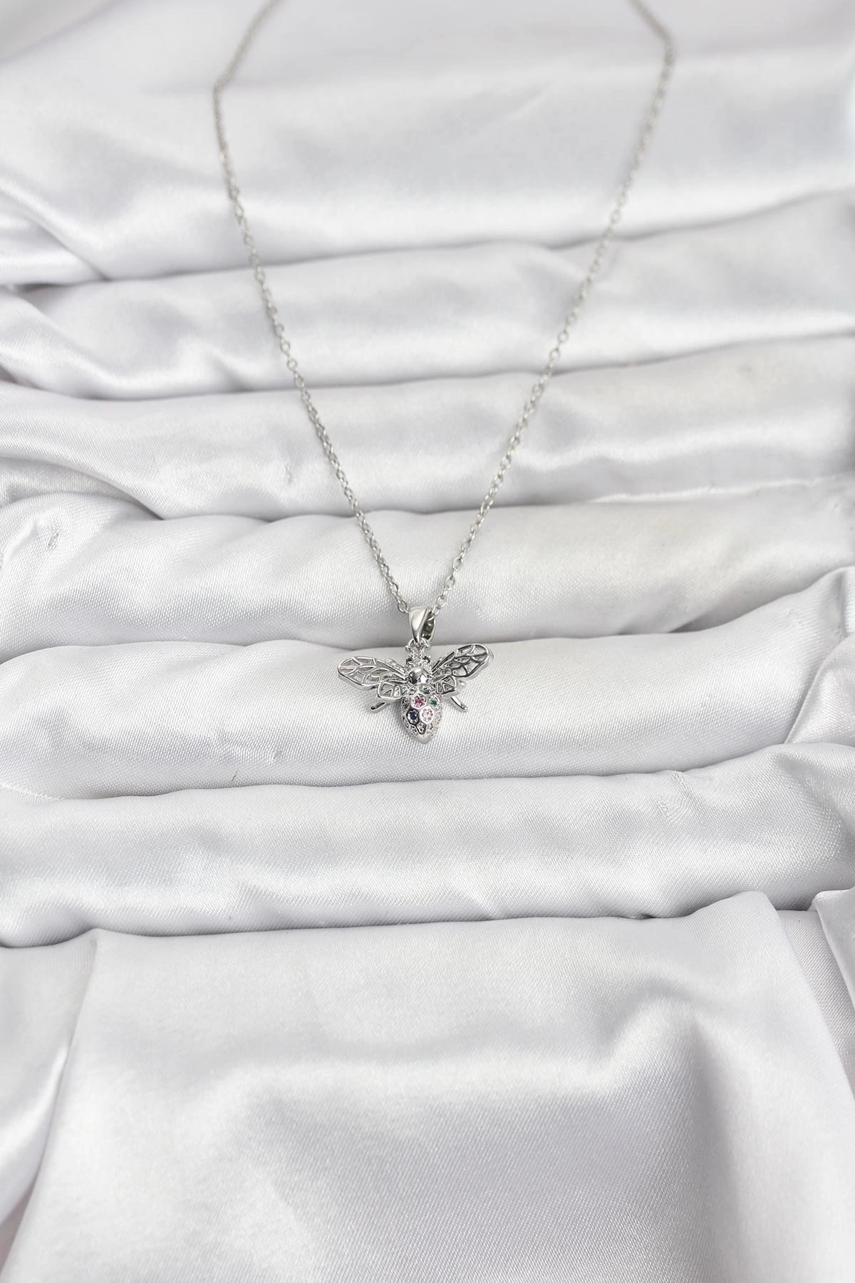 Mey İthalat® 316L Çelik Zincir Gümüş Renk Sinek Model Zirkon Taşlı Kadın Kolye