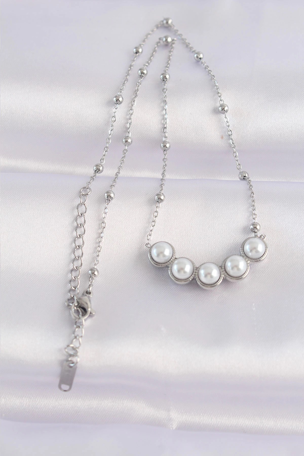 Mey İthalat® 316L Çelik Zincir Gümüş Renk Sıralı İnci Taşlı Kolye